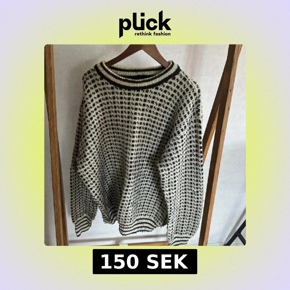 Säljer en stickad tröja från Norcewool i svart och vit med rutigt mönster. Tröjan har ribbade muddar och krage med svarta ränder, samt långärmad passform. Perfekt för dig som gillar retrovibbar och vill ha något unikt i garderoben.