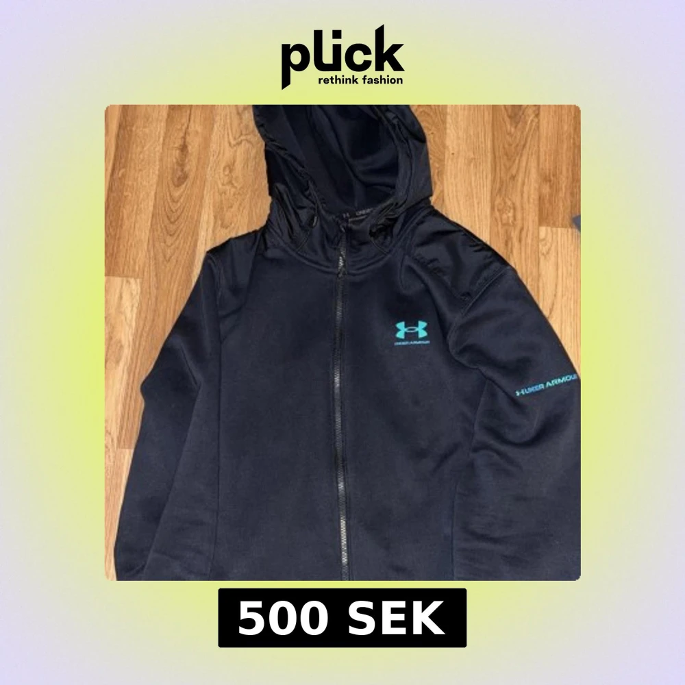 Svart vindjacka från Under Armour med huva och hel dragkedja. Jackan har blå logga på bröstet och ärmen, samt paneler i blankare material över axlarna. Perfekt för dig som gillar sportig stil och vill ha något lätt och smidigt.