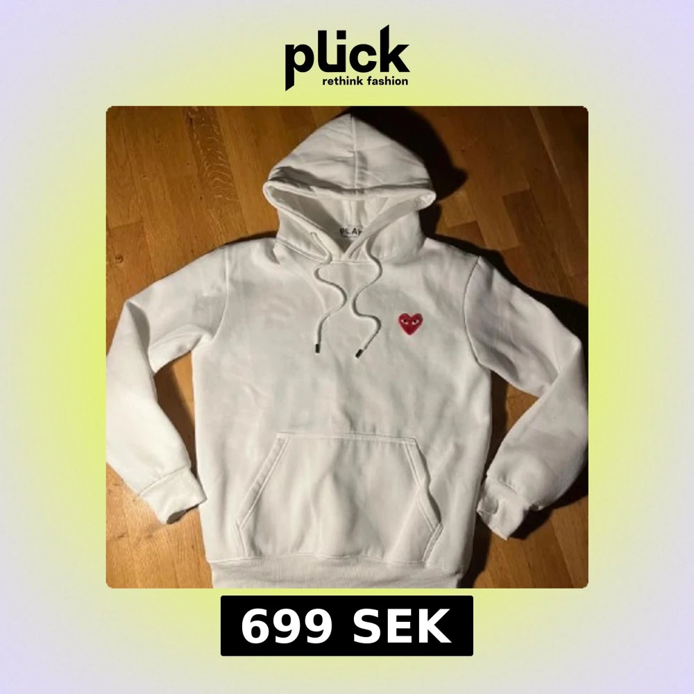 Säljer en vit hoodie från Comme des Garçons Play med det ikoniska röda hjärtat med ögon broderat på bröstet. Tröjan har huva med snörning, magficka och ribbade muddar. Perfekt för dig som gillar stilrena streetwear-plagg. Använd 2 gånger, strl L men sitter som M
