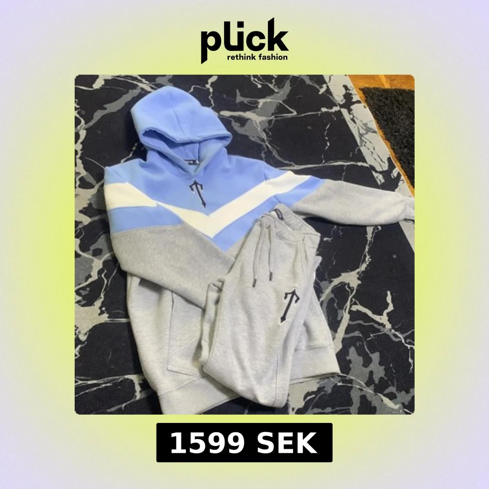 Säljer en snygg hoodie från Trapstar i blått, grått och vitt med huva och lång ärm. Tröjan har en cool vit V-formad detalj över bröstet och Trapstar-logga framtill. Perfekt för dig som gillar streetwear och vill ha något bekvämt och stilrent.