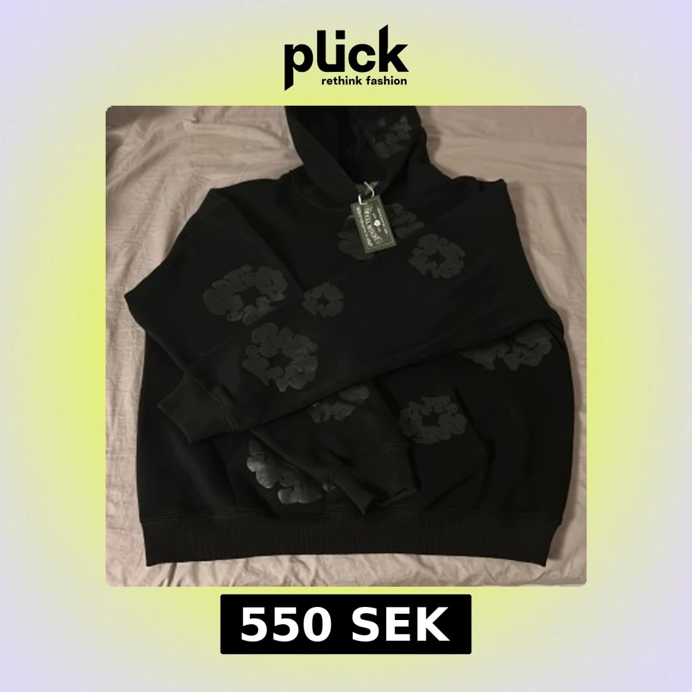 Svart hoodie från Denim Tears med unika blommönstrade tryck i mörkgrått över hela tröjan. Klassisk huva och ribbade muddar. Tillverkad i USA, troligtvis i bomullsmix. Perfekt för dig som gillar streetwear med edge.