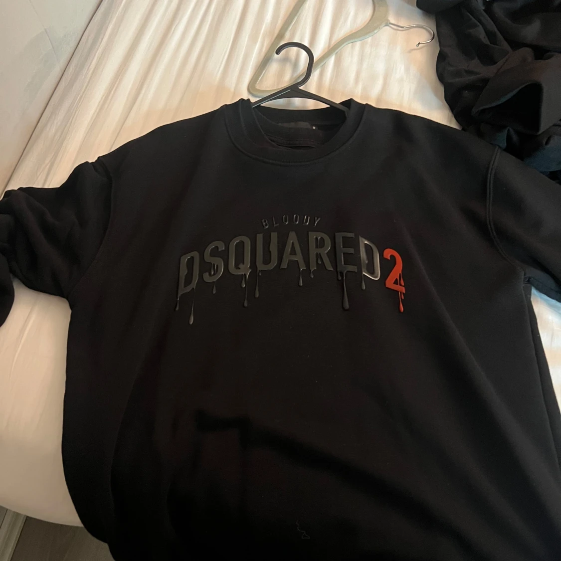 Svart sweatshirt från Dsquared2 med tryckt text 'BLOODY DSQUARED2' på bröstet. Snygg detalj med droppande effekt på bokstäverna och röd siffra 2. Tillverkad i 100% bomull och har rund hals samt långa ärmar.