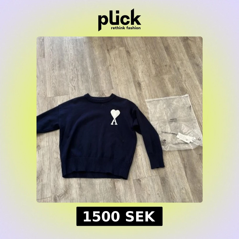 Säljer en snygg mörkblå tröja från Ami paris med en vit hjärtdetalj. Skick 8/10 den är i bra skick, Storlek S/M, priset är inte hugget i sten.