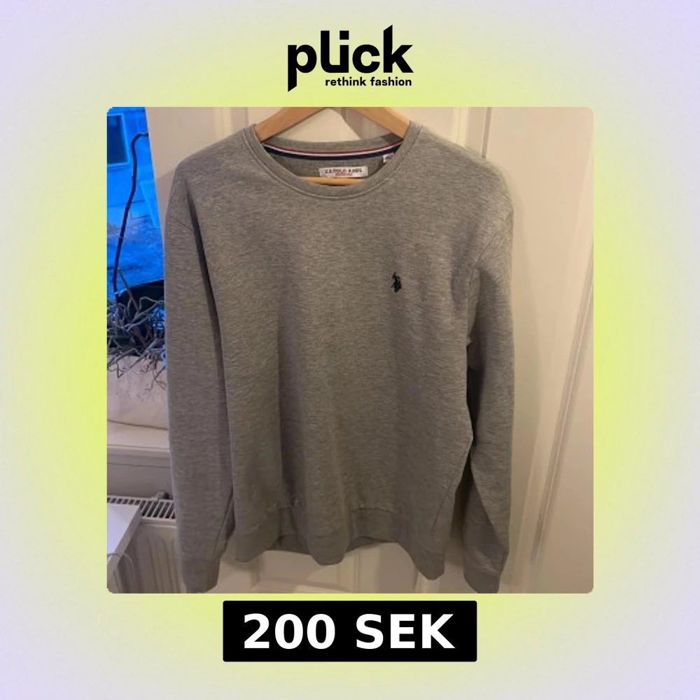 Säljer en stilren grå tröja från U.S. Polo Assn. med rund hals och det klassiska logotypbroderiet på bröstet. Tröjan har långa ärmar och är perfekt för en avslappnad look.