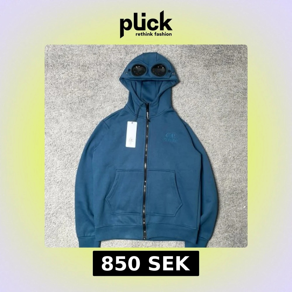 Säljer en helt ny blå hoodie från C.P. Company med dragkedja och de ikoniska glasögonen i huvan. Tröjan har broderad logga på bröstet och en stor magficka framtill. Perfekt för dig som gillar streetwear och unika detaljer. Hör av er vid frågor!