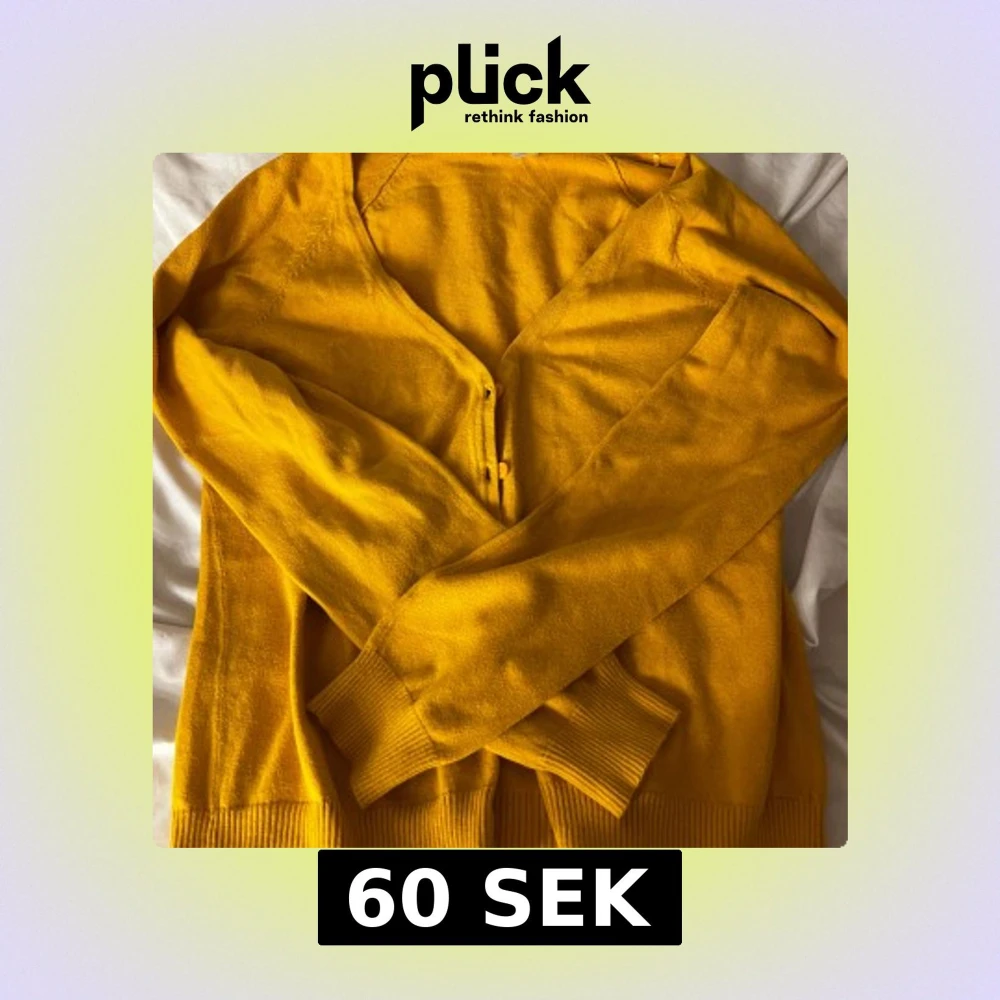 Säljer en snygg gul stickad kofta med långa ärmar och knappar framtill. Koftan har ribbade muddar vid ärmslut och nederkant, perfekt för lite färg i din outfit.