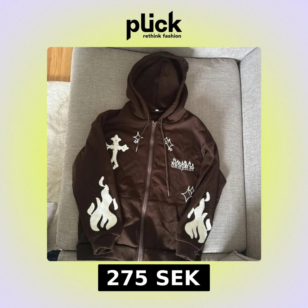 Cool brun hoodie med dragkedja och huva. Har vita tryck med eldflammor, kors och stjärnor på framsidan och ärmarna. Perfekt för dig som vill sticka ut med en unik streetstyle.