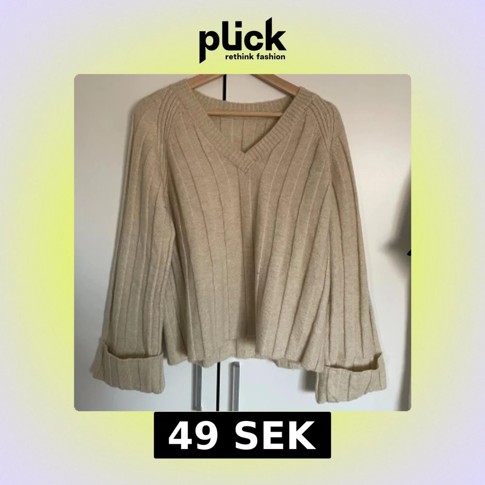 Mysig beige stickad tröja med v-ringad hals och ribbat mönster. Tröjan har långa ärmar med uppvikta muddar och en avslappnad passform.