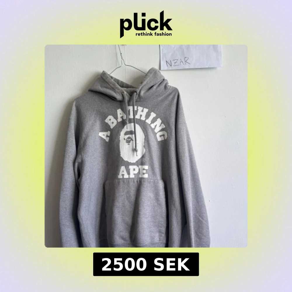 Säljer en grå hoodie från A Bathing Ape med stor vit logotyp och apans ansikte tryckt på bröstet. Tröjan har huva med snörning och en klassisk känguruficka framtill. Perfekt för dig som gillar streetwear och vill sticka ut med ett ikoniskt märke.