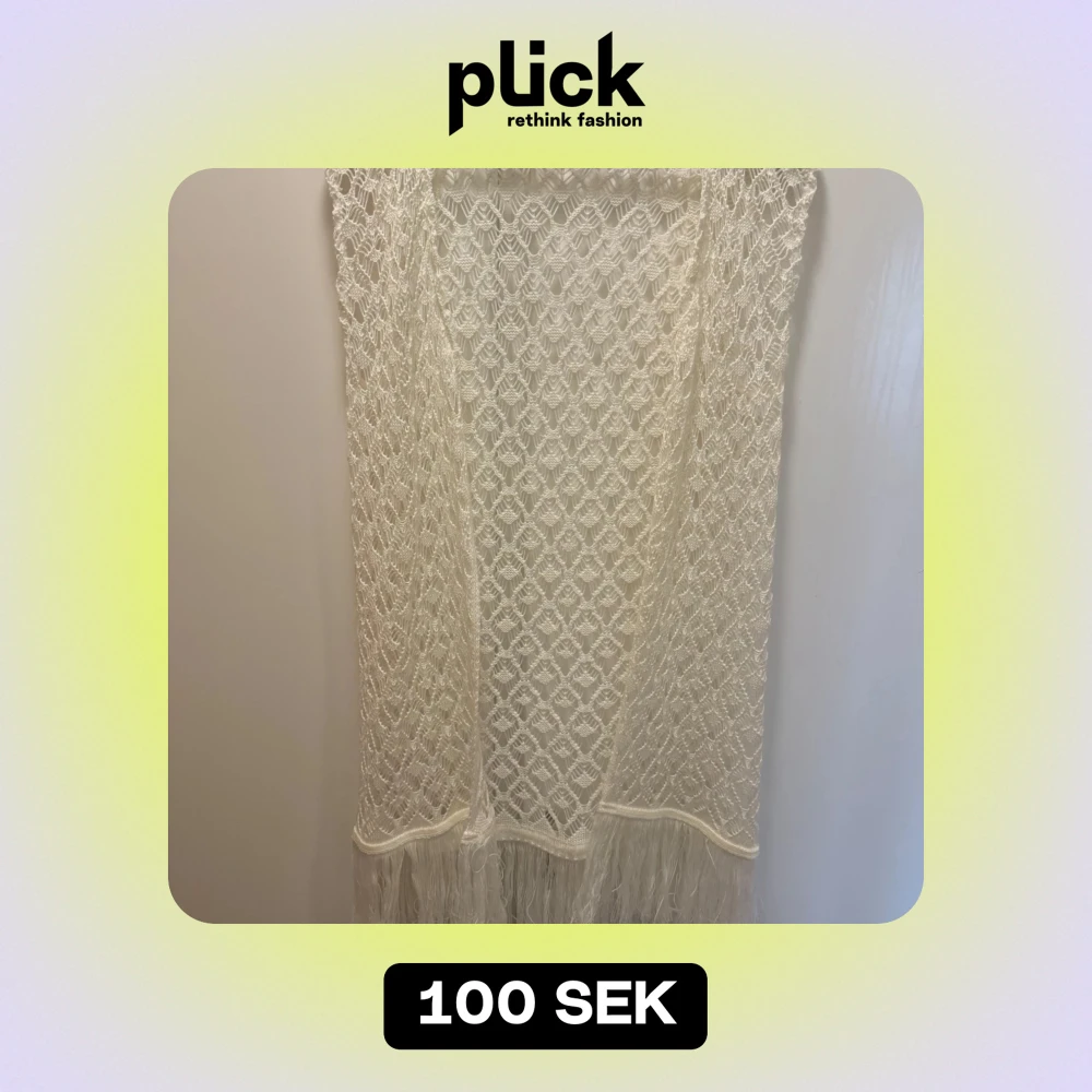 Säljer en vacker vit spetskofta från Elitza i storlek M. Klänningen har ett elegant mönster och fransar längst ner som ger en bohemisk känsla. Perfekt för sommarens fester eller en dag på stranden. Den är ärmlös och har en luftig passform.