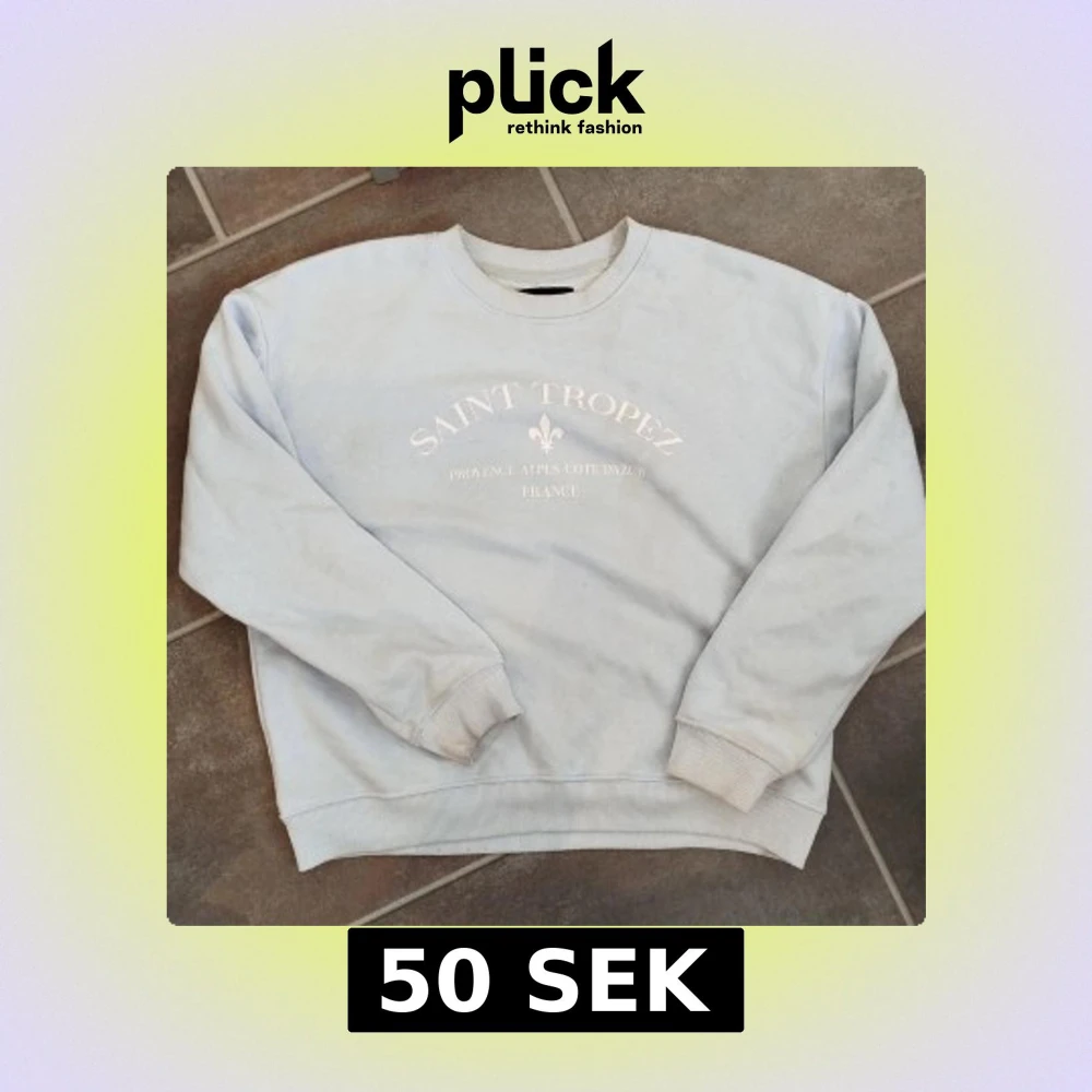Ljusblå sweatshirt med vit text och tryck framtill där det står 'Saint Tropez Provence Alpes-Côte d'Azur France'. Tröjan har rund hals, ribbade muddar och är långärmad. Perfekt för en chill och avslappnad stil.
