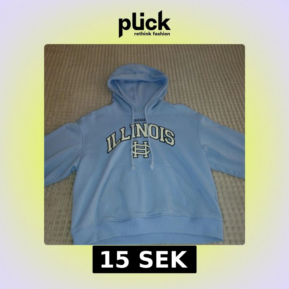 Ljusblå hoodie från H&M Divided med stor tryckt text 'Illinois Chicago' på bröstet. Klassisk känguruficka framtill, snörning i huvan och mjukt material. Väldigt skön att ha på sig,❤️Perfekt för en chill och sportig look.