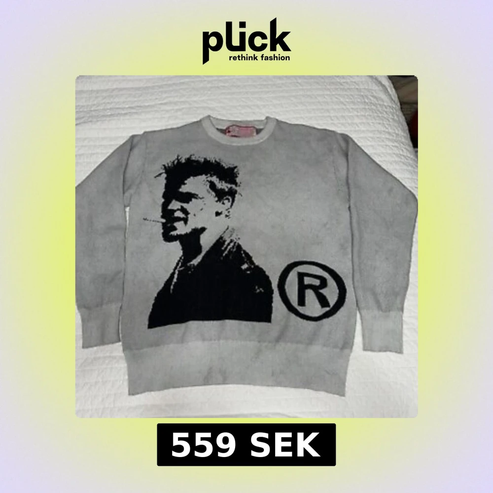 Säljer nu en galet snygg grå stickad tröja med svart grafiskt print på Tyler durden från fight club. Tröjan har rund halsringning och långa ärmar. Perfekt för dig som gillar unika och snygga plagg.