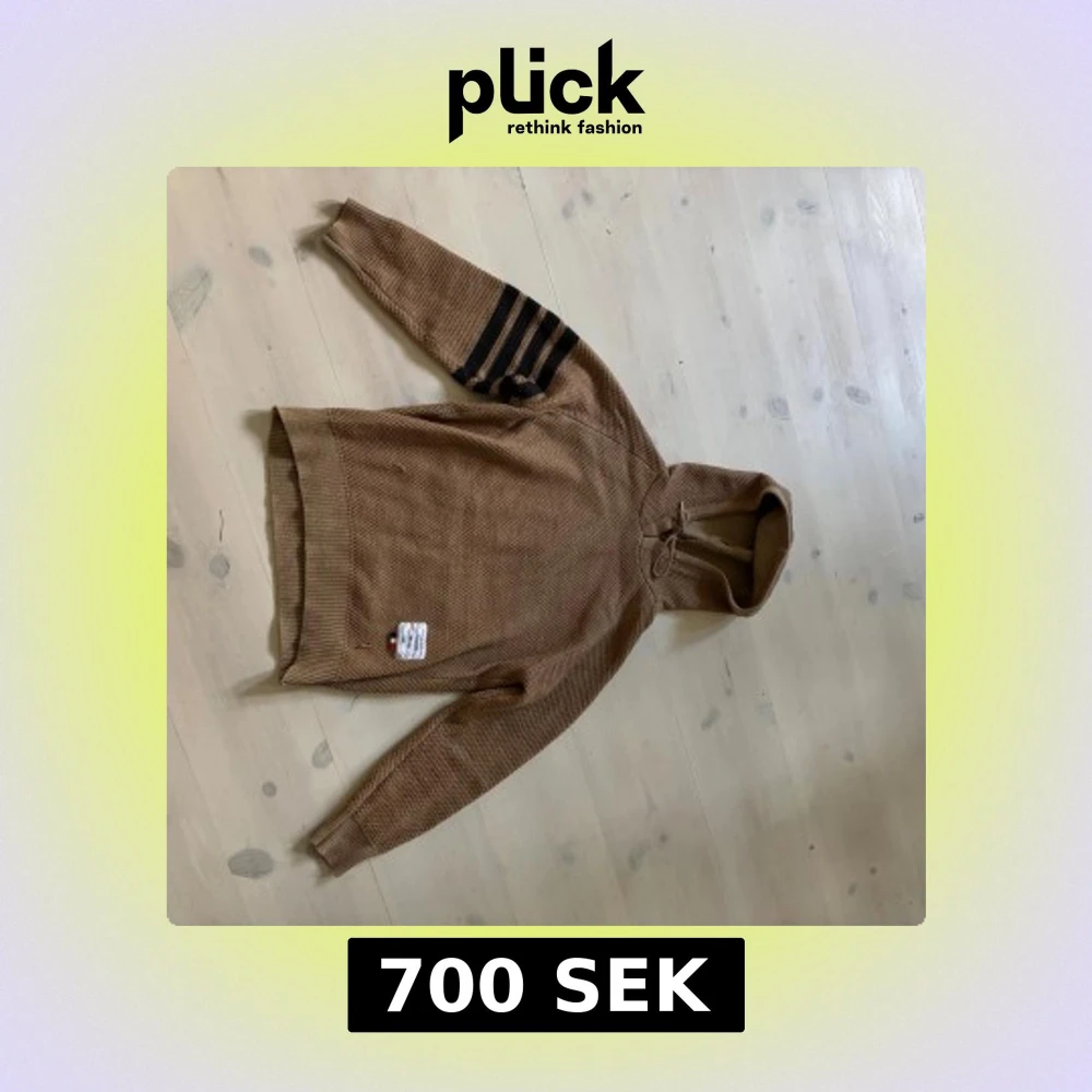 Säljer en beige stickad hoodie liknande Thom Browne med fyra svarta ränder på ena ärmen. Tröjan har huva med snörning och ribbade muddar. Perfekt för dig som gillar stilrena detaljer och exklusiva kläder