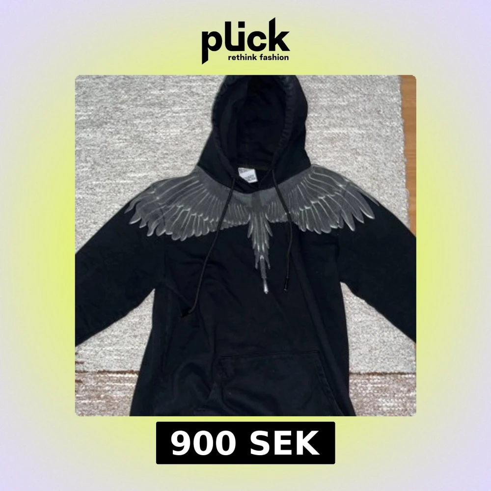 Säljer en svart hoodie från Marcelo Burlon med unikt vingmönster i grått över axlar och bröst. Tröjan har huva med dragsko och en stor magficka. Perfekt för dig som vill sticka ut med en cool streetwear-stil.