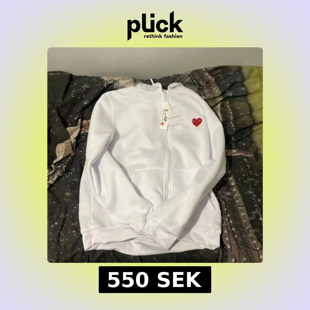 Säljer en clean vit hoodie från Comme des Garçons Play med dragkedja och huva. Tröjan har det ikoniska röda hjärtat broderat på bröstet och praktiska fickor framtill. Perfekt för dig som gillar stilrena och trendiga plagg.
