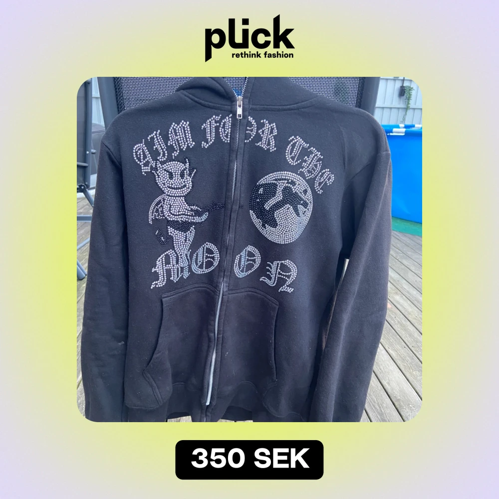 Säljer en svart hoodie med coolt tryck 'AIM FOR THE MOON' och en figur på framsidan. Den har dragkedja och är i bra skick. Perfekt för höst och vinter, och passar till vardags eller chill dagar. Storleken är M och denna snygga tröja kommer tyvärr inte till användning längre