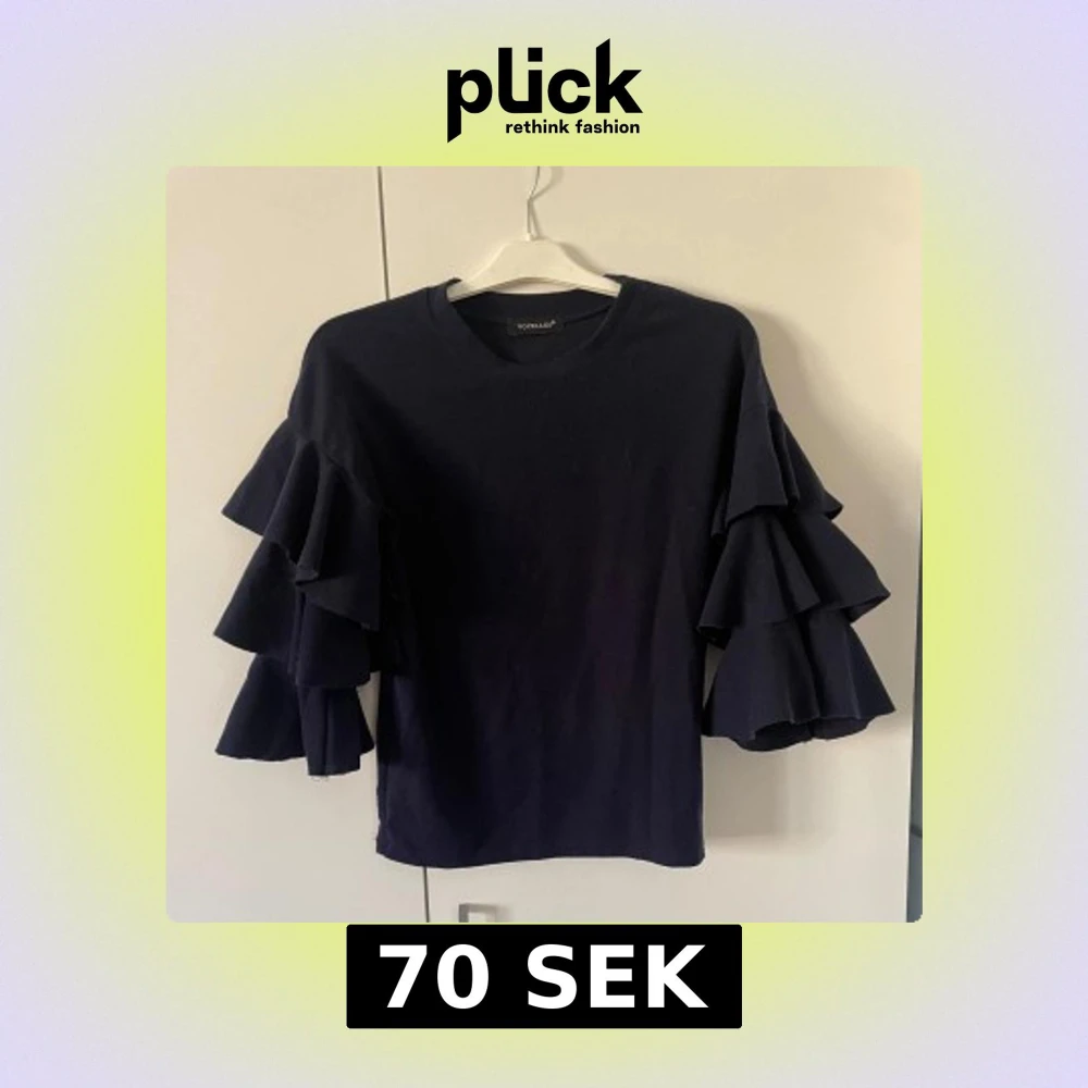 Snygg marinblå tröja från Votelle med unika volangärmar som ger en trendig look. Perfekt för att piffa upp din garderob med något speciellt. Passar bra till både jeans och kjol.