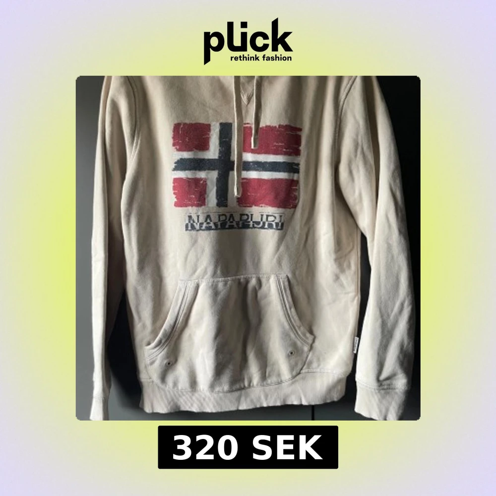 Säljer en beige hoodie från Napapijri med en stor norsk flagga tryckt på framsidan. Tröjan har en känguruficka och justerbar huva med snören. Perfekt för en avslappnad stil.