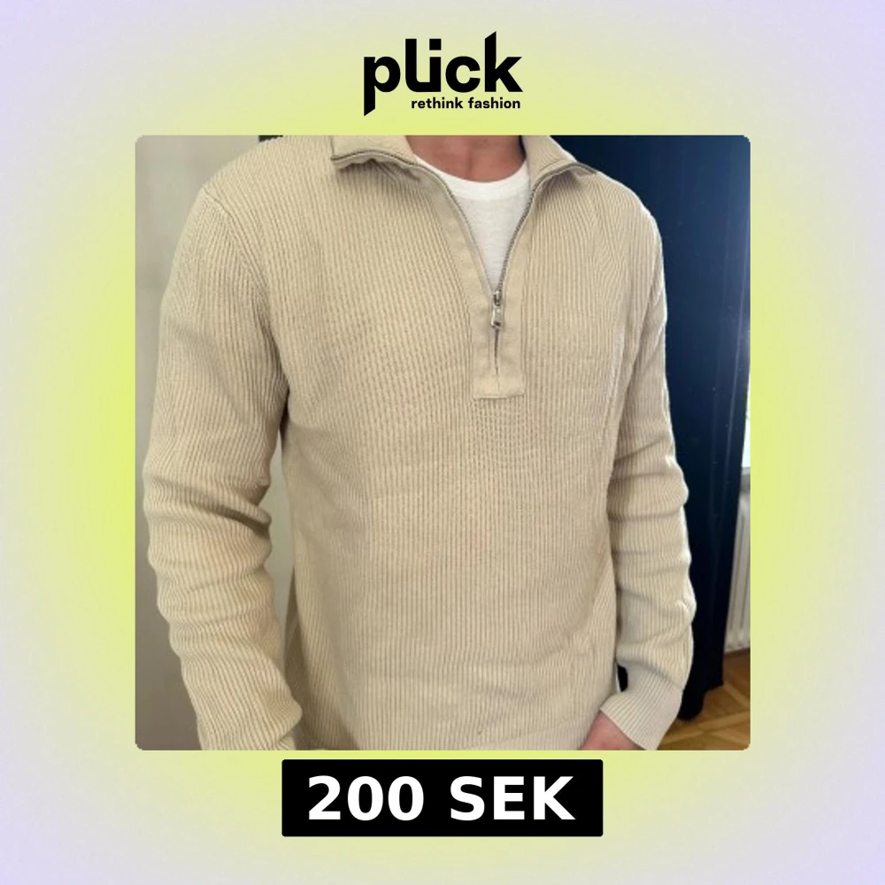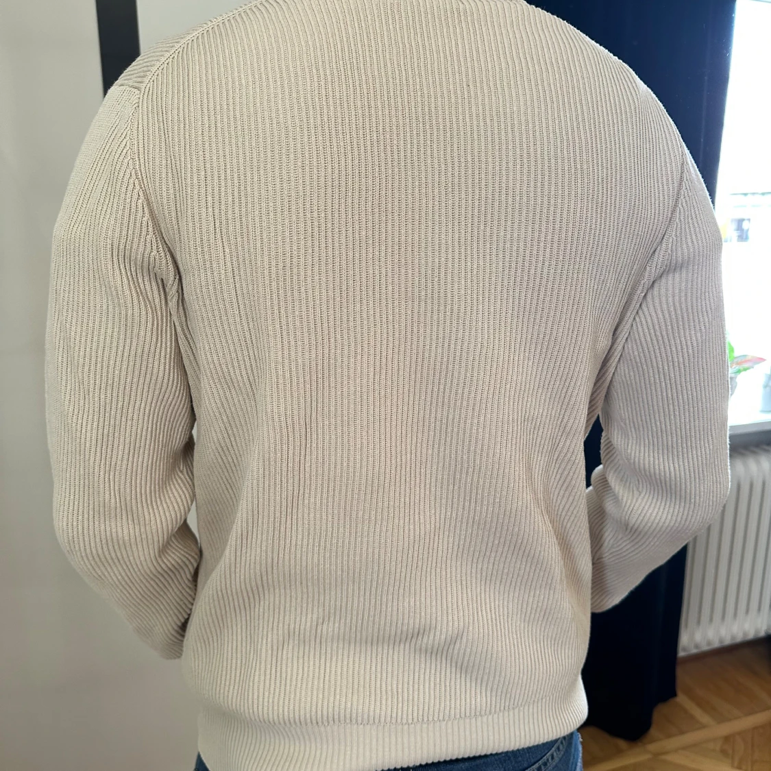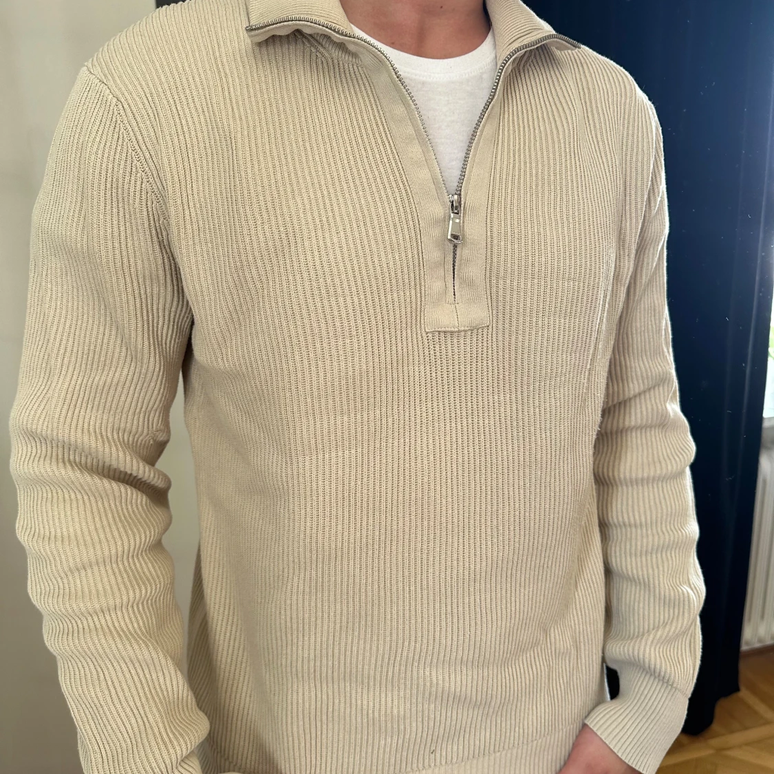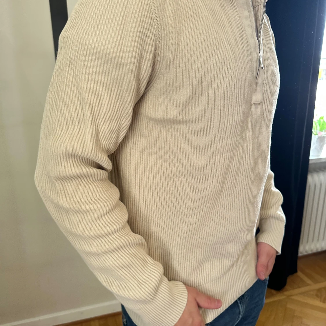 Säljer en beige stickad tröja med ribbad struktur och half zip-dragkedja vid halsen. Tröjan har lång ärm och en klassisk, avslappnad passform. Perfekt för lager-på-lager och enkel att matcha med jeans eller chinos.