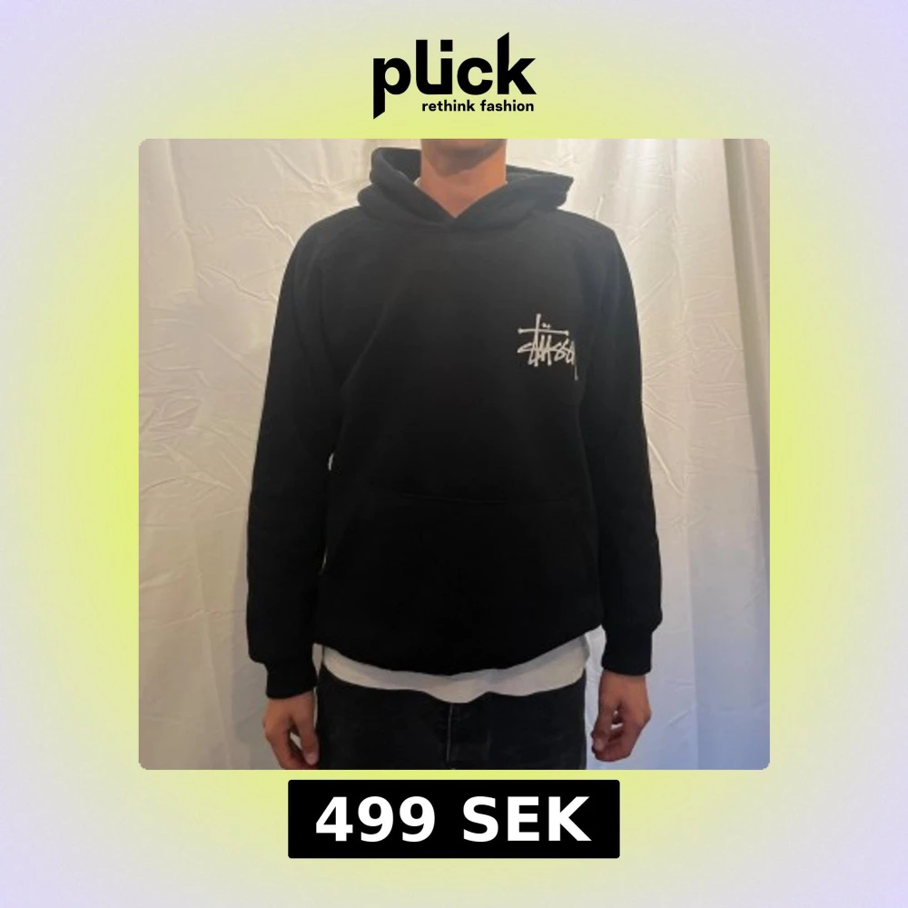 (Hoodien är uppvikt i midjan) Svart hoodie från Stüssy med vit logga på bröstet och på ryggen. Klassisk ficka framtill, luva och ribbade muddar. Perfekt streetwear-plagg med avslappnad passform. Storlek M, Modellen är 180cm