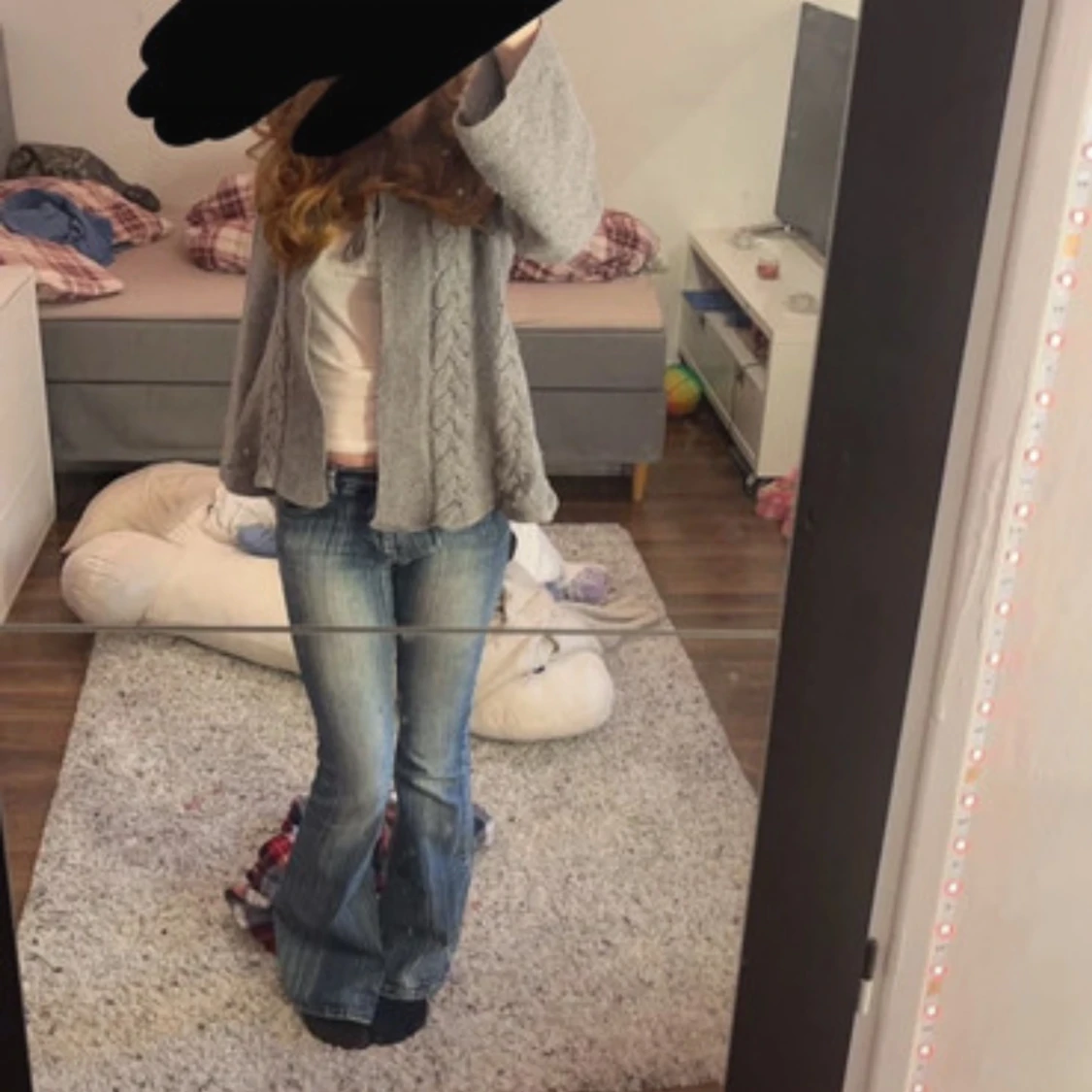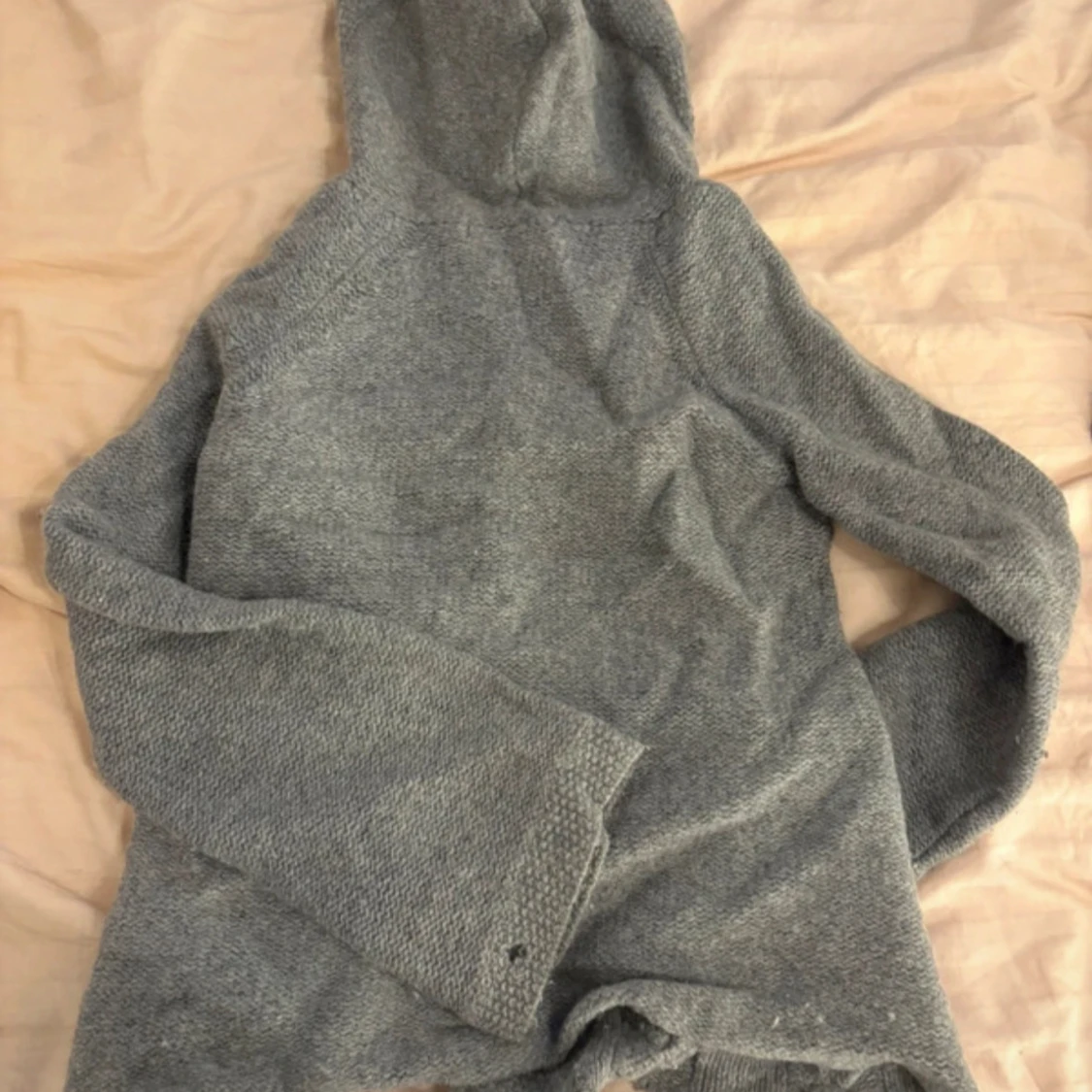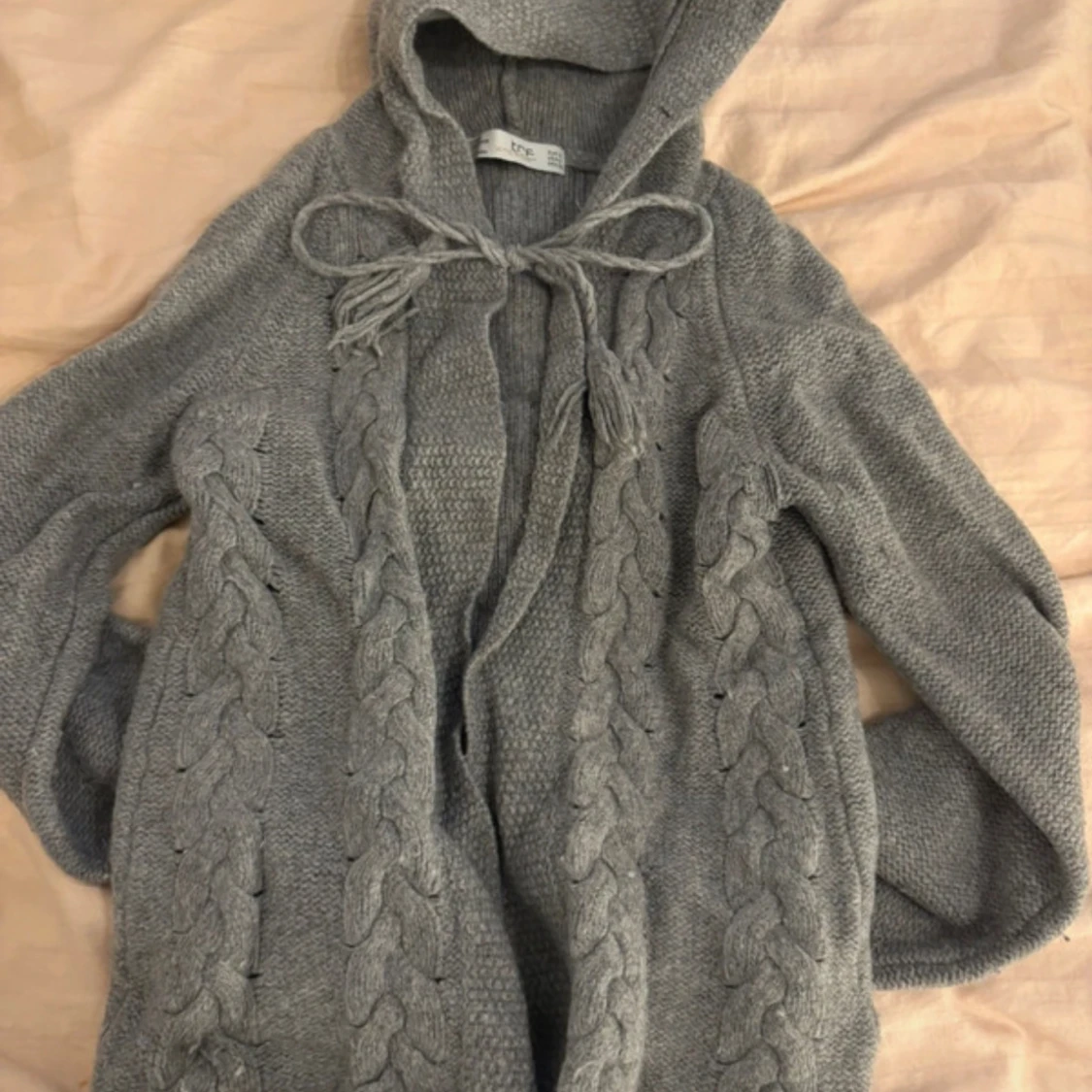 Säljer en mysig grå stickad kofta från TRF med flätmönster och huva. Koftan har långa ärmar och knytband framtill. Perfekt för kyliga dagar!