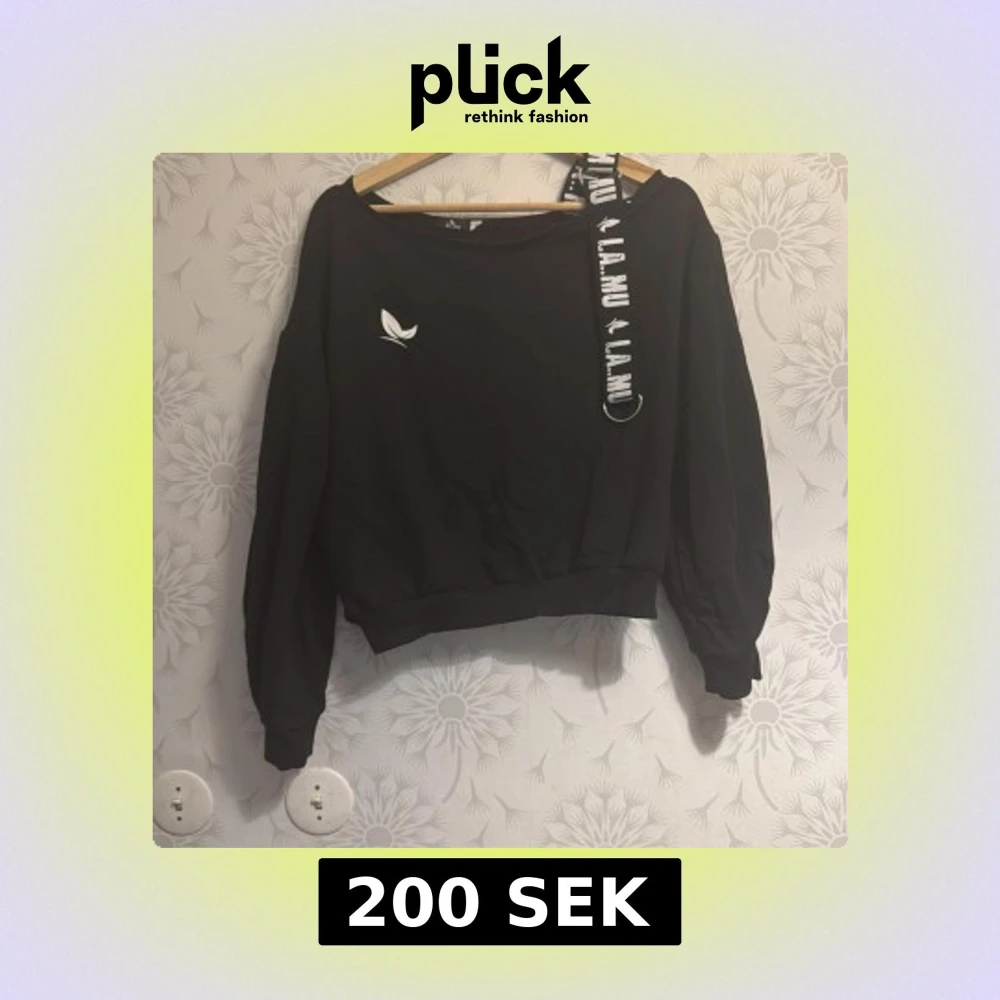 Snygg svart offshoulder tröja från Lamu med en cool banddetalj på axeln. Tröjan har långa ärmar och en avslappnad passform, perfekt för en trendig look. Passar bra till både jeans och kjol!