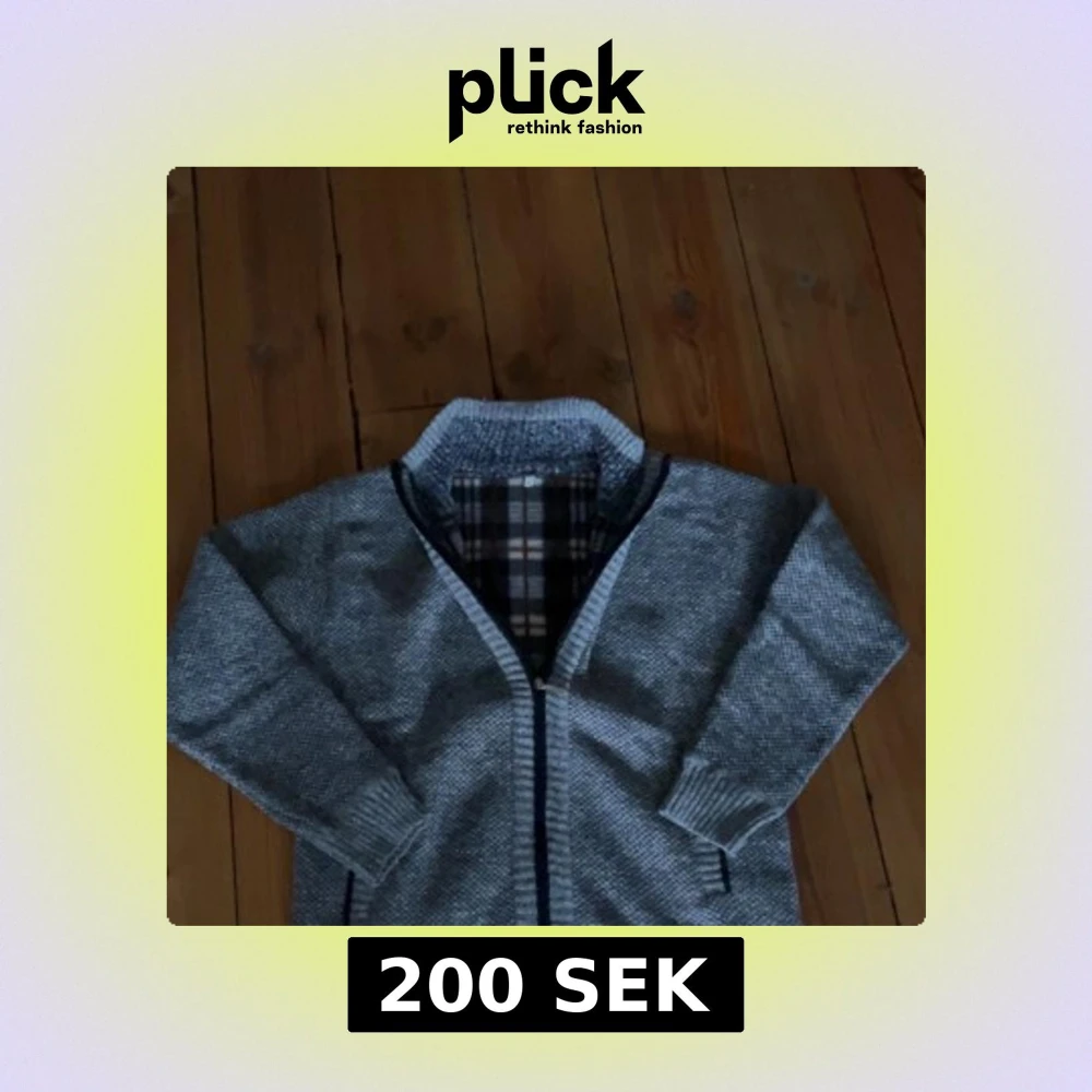 Säljer en helt oanvänd grå stickad kofta med dragkedja och ribbade muddar. Insidan har ett rutigt foder i svart, vitt och rött. Perfekt för kyliga dagar och har en klassisk look med hög krage och två fickor framtill.