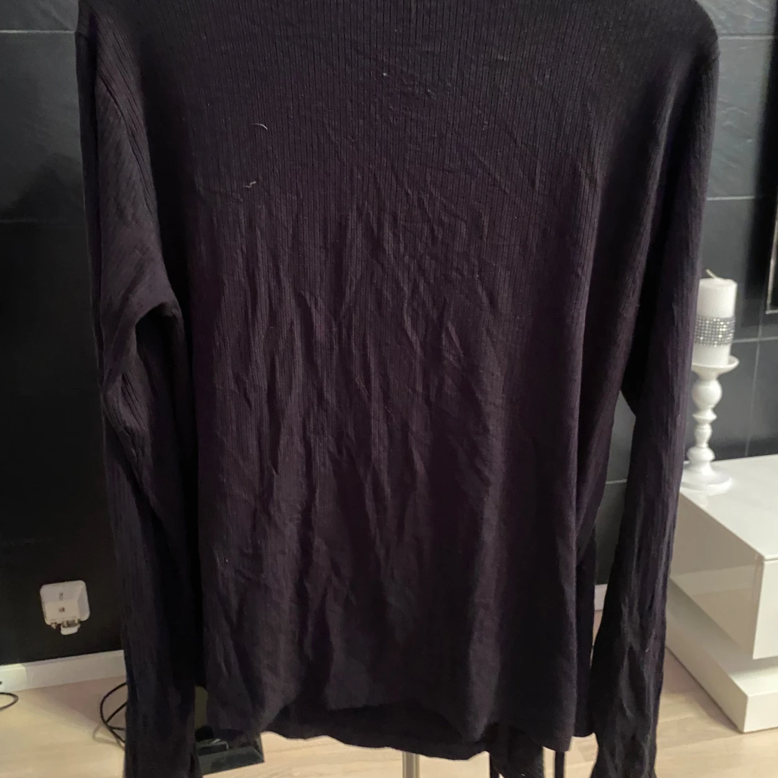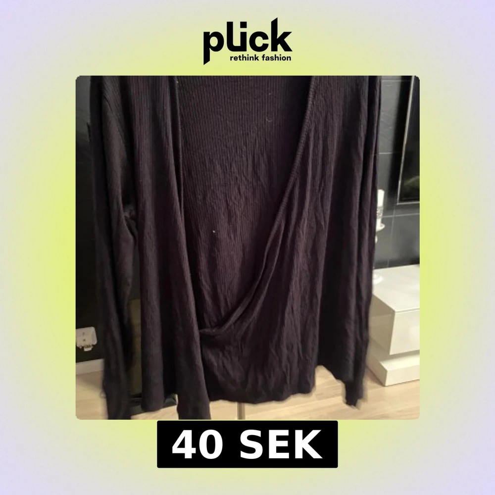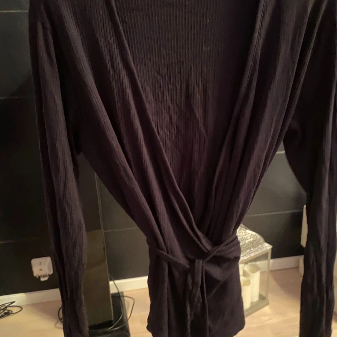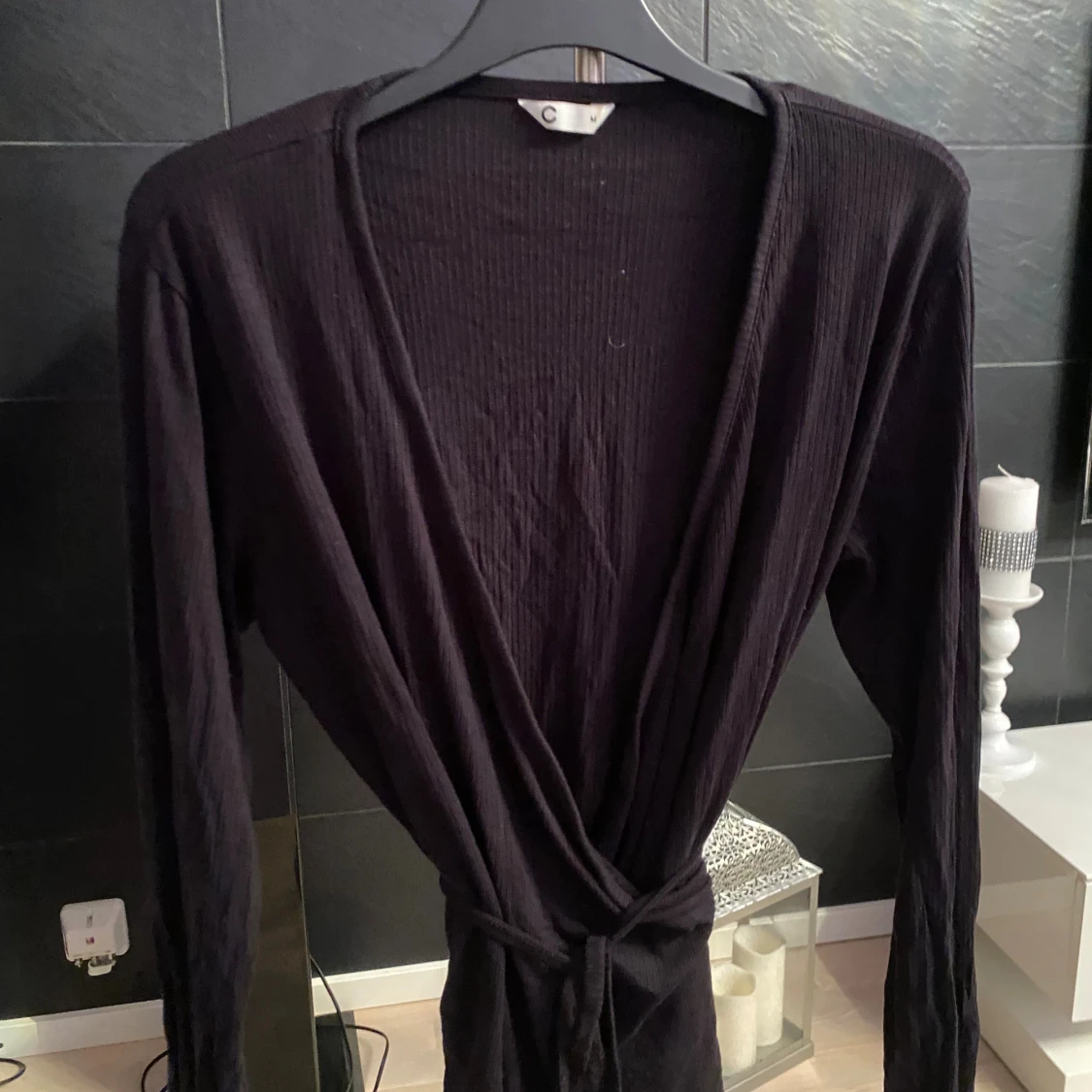 Svart ribbad omlottkofta från Gina Tricot med långa ärmar och knytband i midjan. Koftan har djup v-ringning och är tillverkad i mjukt, stretchigt material som sitter snyggt på kroppen. Perfekt för dig som gillar stilrena och enkla plagg.