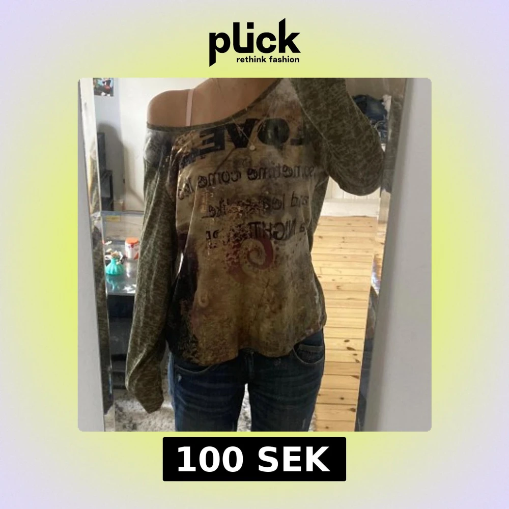 Långärmad topp från Liberty med grönmelerade ärmar och tryckt text och mönster framtill. Strl M, fraktar gärna tillsammans med andra plagg.