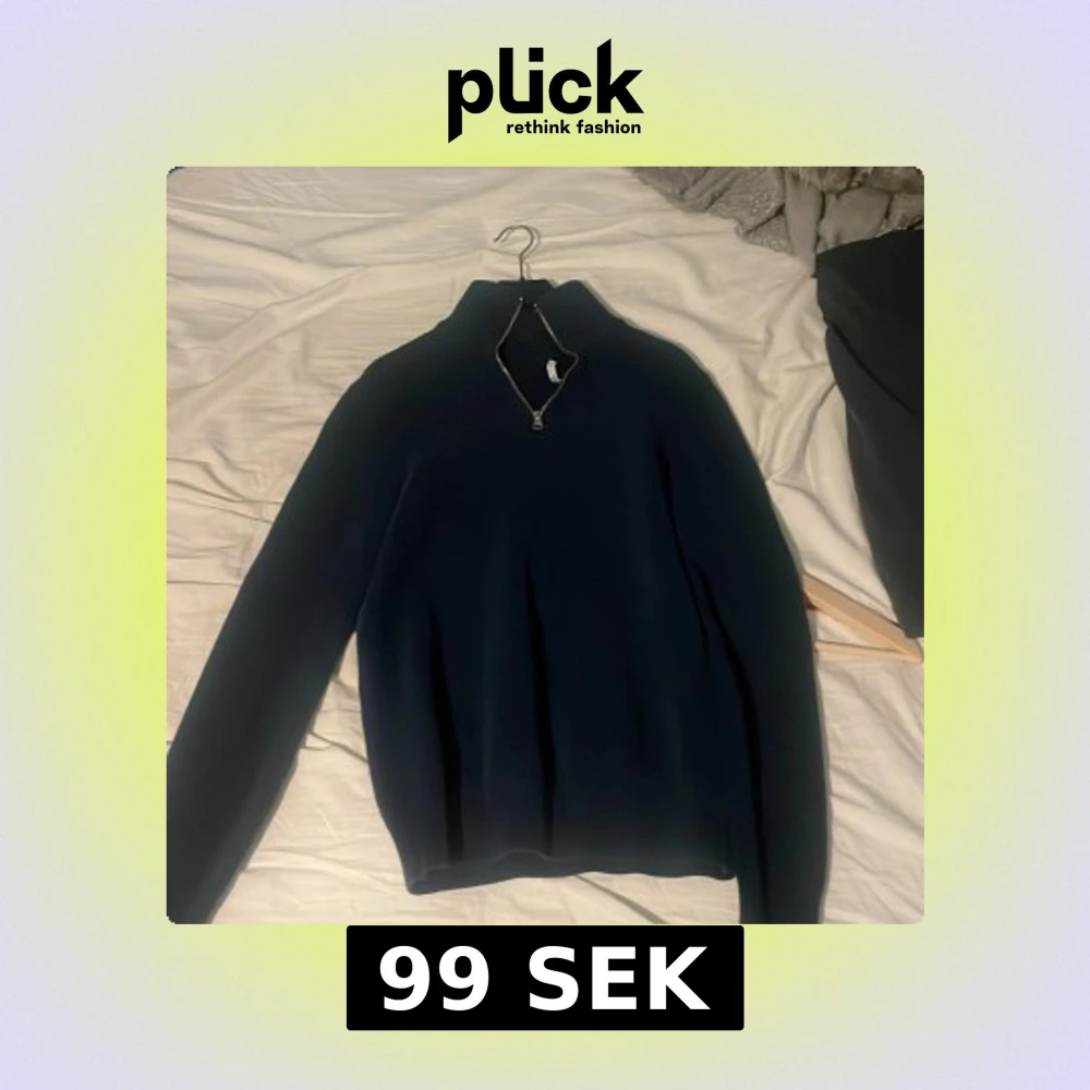 Säljer en stilren mörkblå tröja med dragkedja vid halsen. Perfekt för en avslappnad look. Tröjan har långa ärmar och en enkel design som passar till det mesta.