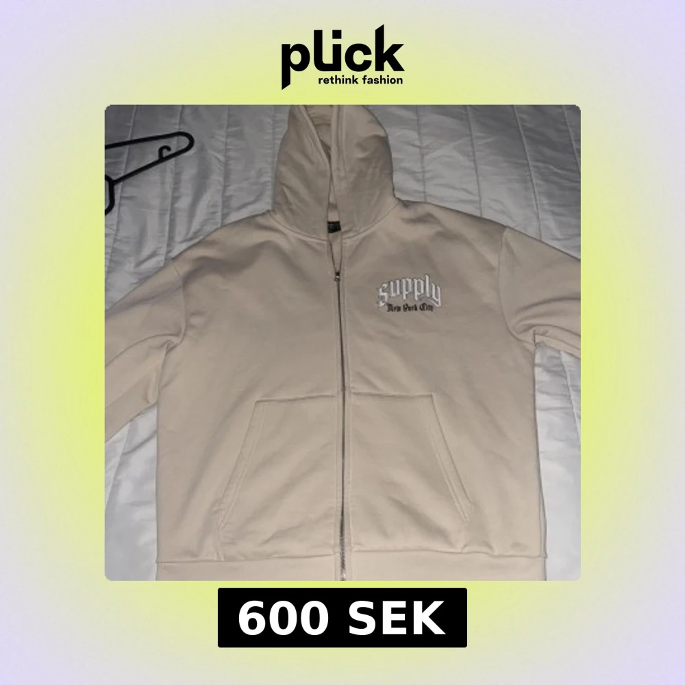 Kom med pris. Beige hoodie från Supply & Demand med dragkedja och huva. Aldrig använt pågrund av att den är för stor. Framsidan har tryck med 'Supply New York City' och baksidan har en stor ängel-grafik och text. Mjuk insida och känguruficka framtill. Perfekt för en streetwear-look.