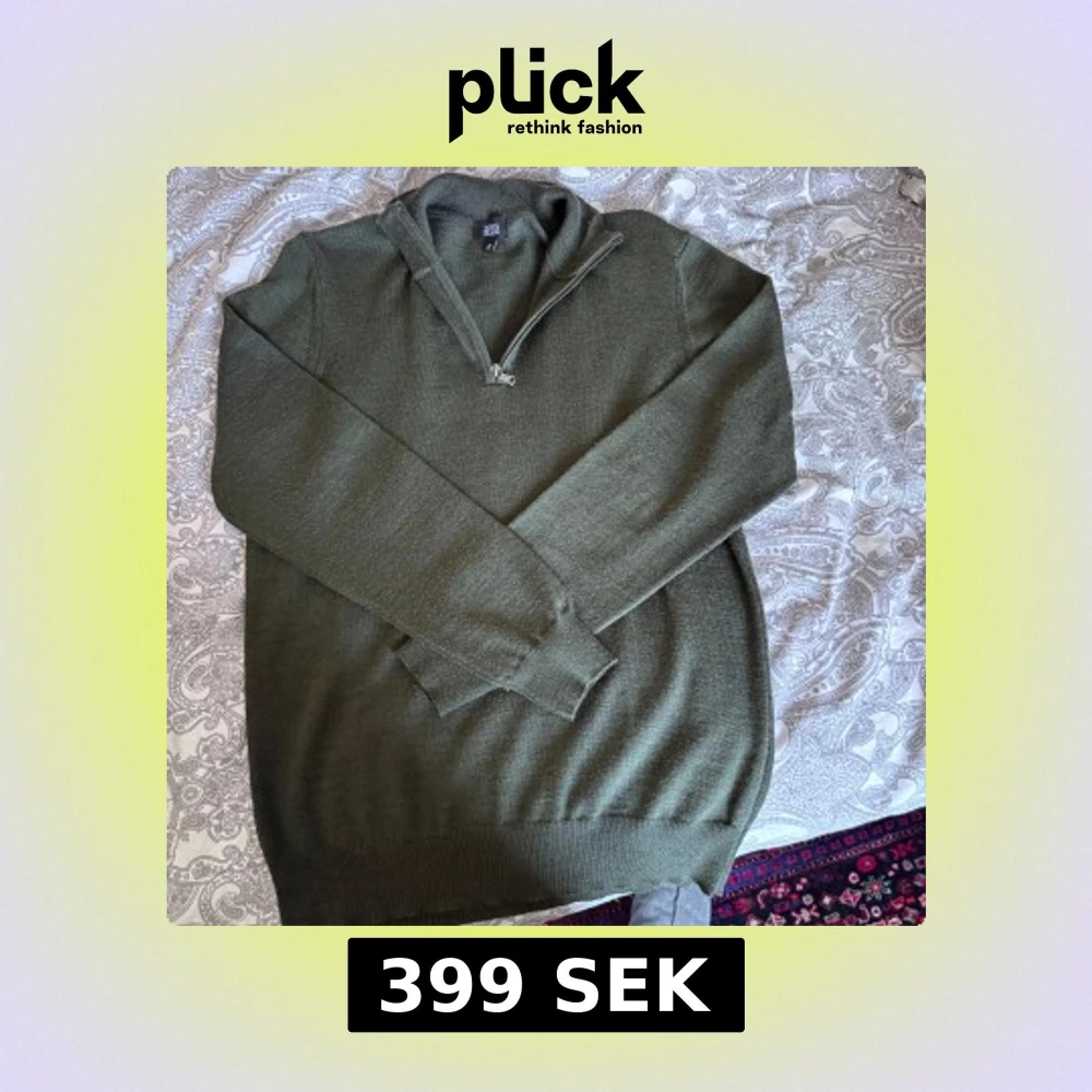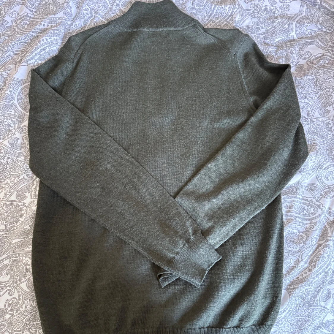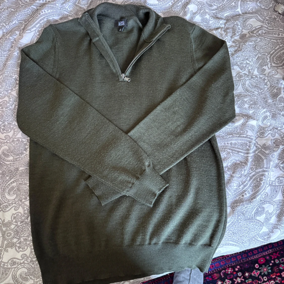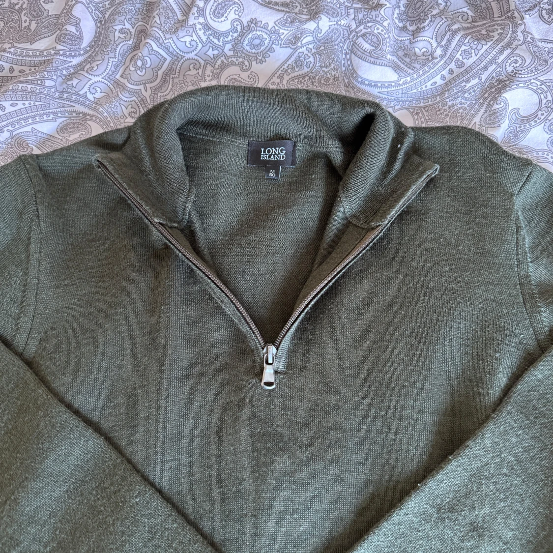 Säljer en olivgrön stickad tröja från Long Island med halv dragkedja vid halsen. Tröjan har lång ärm och ribbade muddar vid ärmslut och nederkant. Perfekt för lager-på-lager under kyliga dagar.