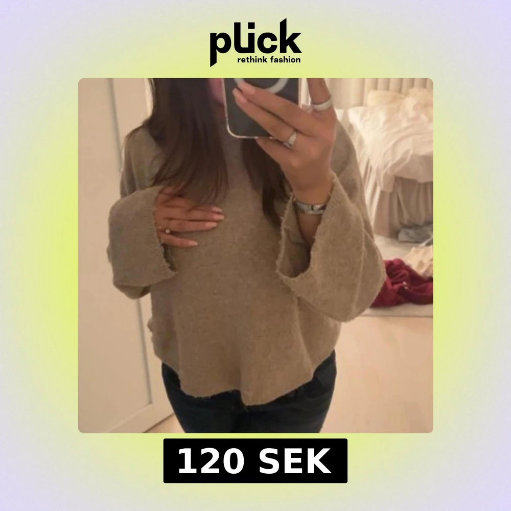 Mysig beige stickad tröja med långärmade ärmar. Perfekt för kyligare dagar och ger en avslappnad look. Passar bra till jeans eller kjol. Säljer då den e lite kort för min smak