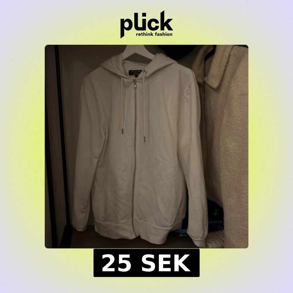 Säljer en stilren vit hoodie från Primark. Den har en dragkedja framtill och justerbara snören vid huvan. Perfekt för en avslappnad look.