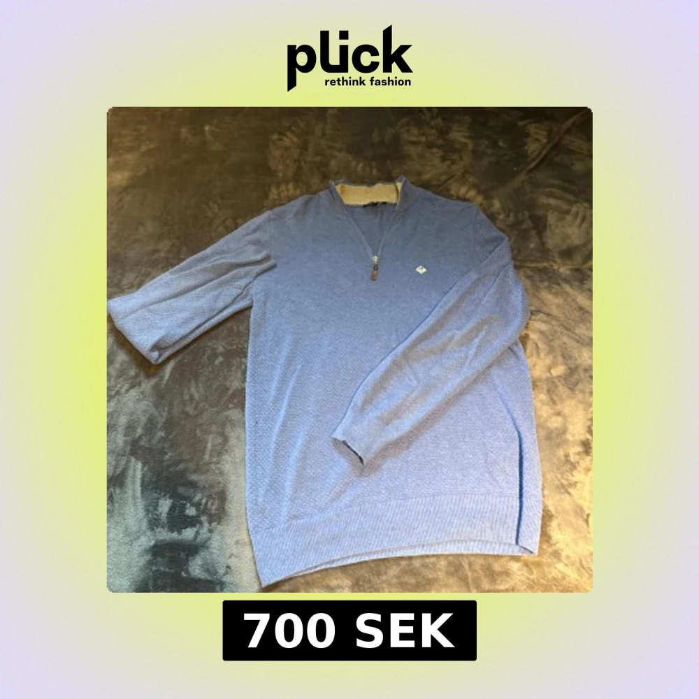 Snygg blå långärmad tröja från Sir Raymond Tailor i storlek M. Tröjan har ett diskret mönster, ribbade muddar och krage i kontrastfärg. Half zip framtill med läderdetalj på dragkedjan och broderad logga på bröstet. Perfekt för chill dagar.