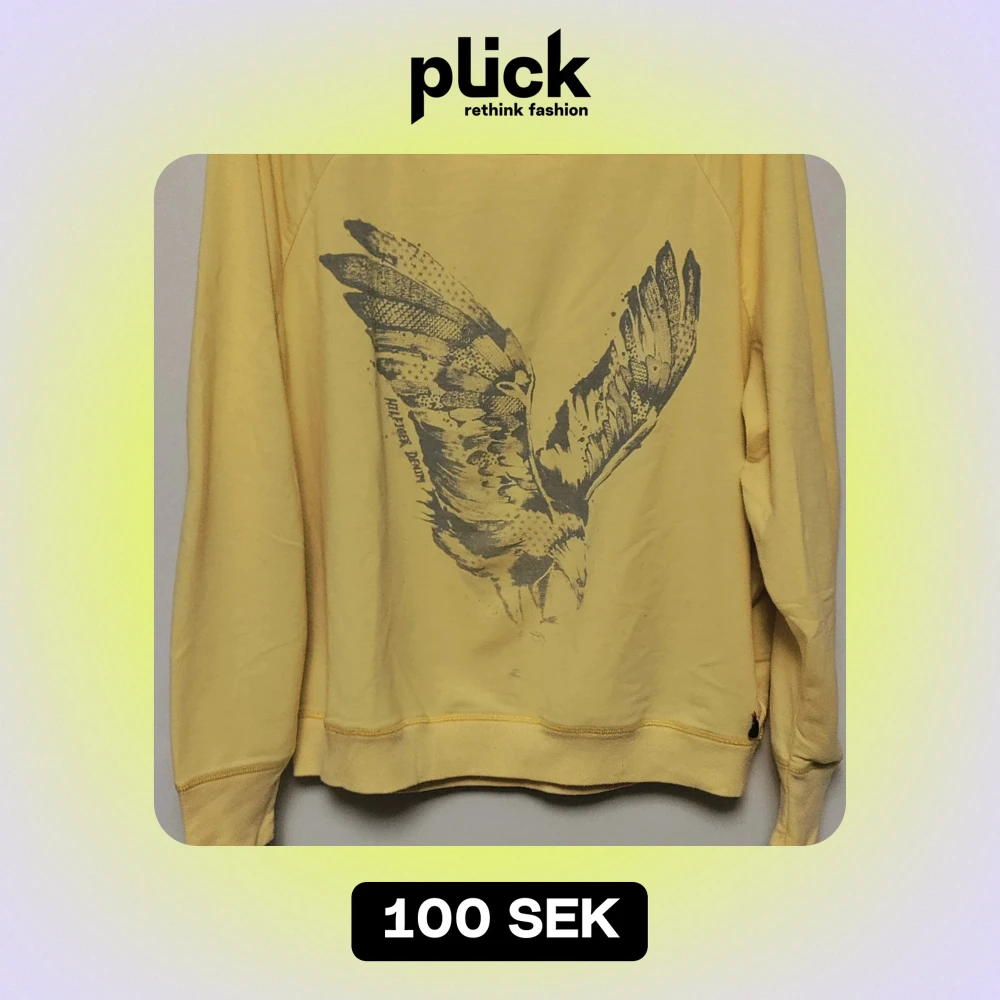 Säljer en cool gul tröja från Hilfiger Denim med ett stort tryck av en örn på framsidan. Tröjan har långa ärmar och är perfekt för en avslappnad stil. Den är i bra skick och passar perfekt till både jeans och shorts. Perfekt för vår och sommar!