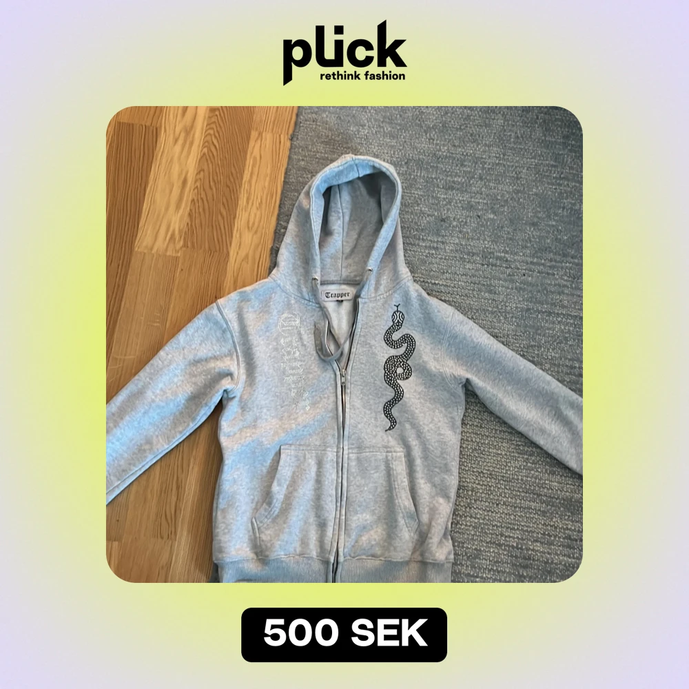 Säljer en snygg grå hoodie från Trapper i storlek M. Den har ett coolt ormmönster i svart och glittrande detaljer på framsidan. Perfekt för en avslappnad stil med dragkedja och huva. Passar bra till både vardag och chill.