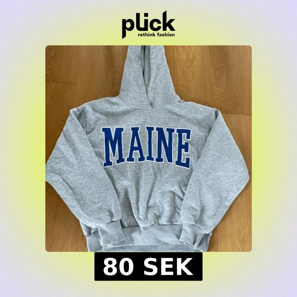 Säljer en grå hoodie med blått MAINE-tryck på bröstet. Klassisk modell med huva och ribbade muddar vid ärmslut och nederkant. Perfekt för en avslappnad stil.