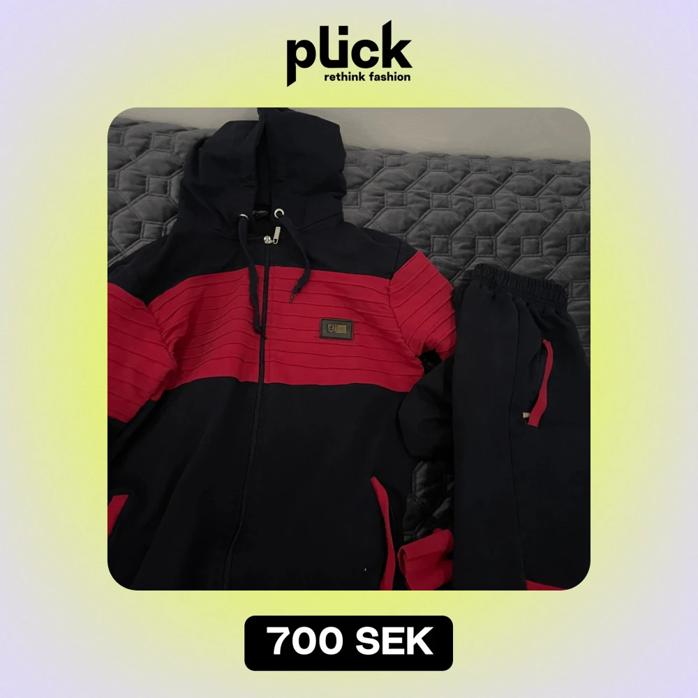 Säljer en snygg svart och röd hoodie från Armani Jeans. Den har en dragkedja framtill och en justerbar huva med snören. Tröjan är randig och har en logga på bröstet. Perfekt för en casual look eller träning. Passar bra till höst och vår! Storlek M