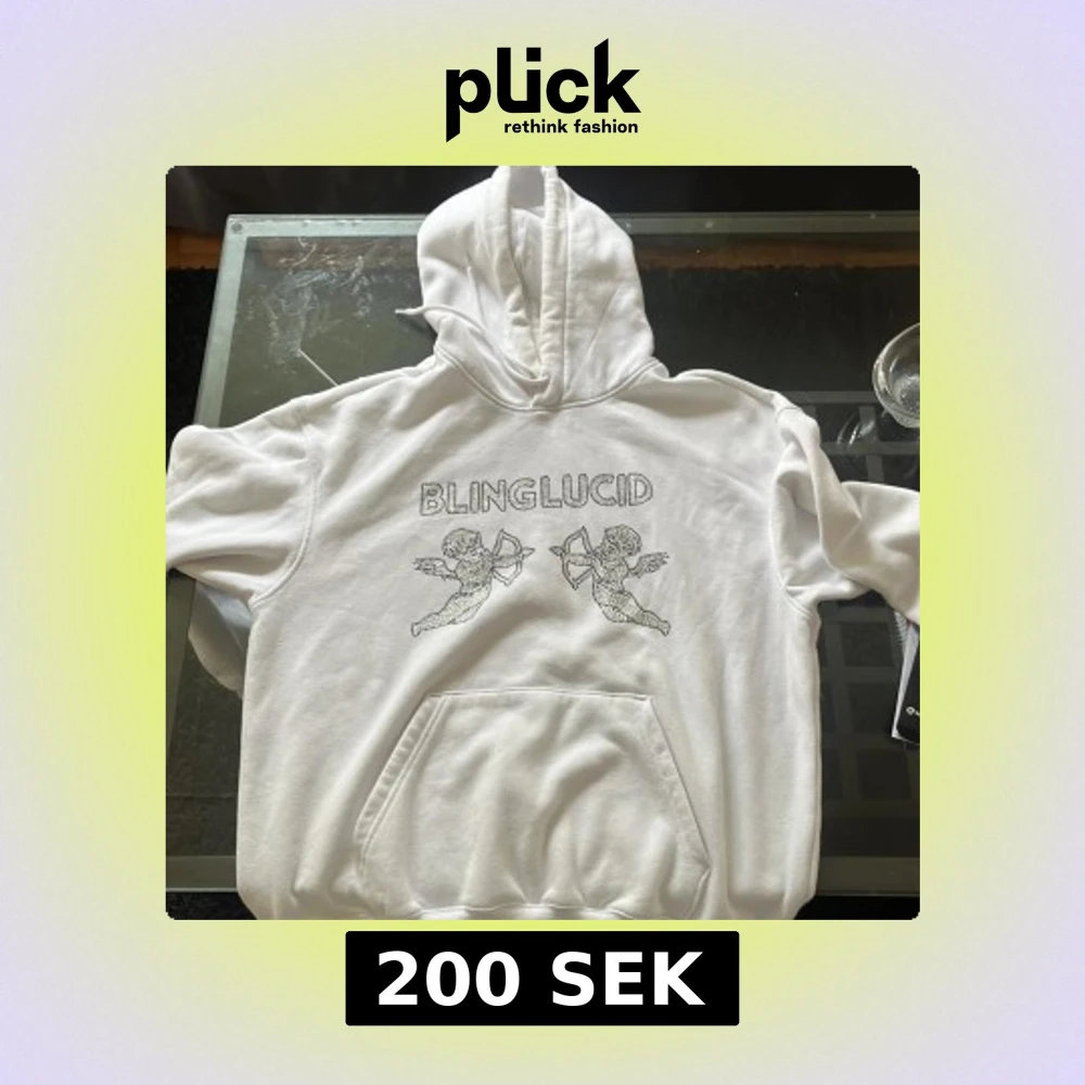 Vit hoodie från Blinglucid med glittrande text och två änglar framtill. Klassisk känguruficka och huva. Perfekt för dig som gillar streetstyle och vill sticka ut med snygga detaljer.