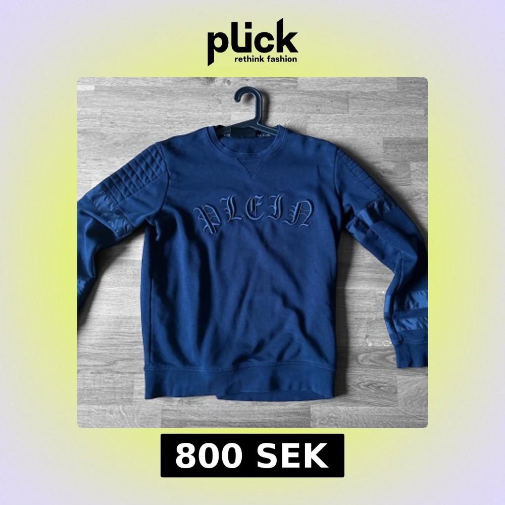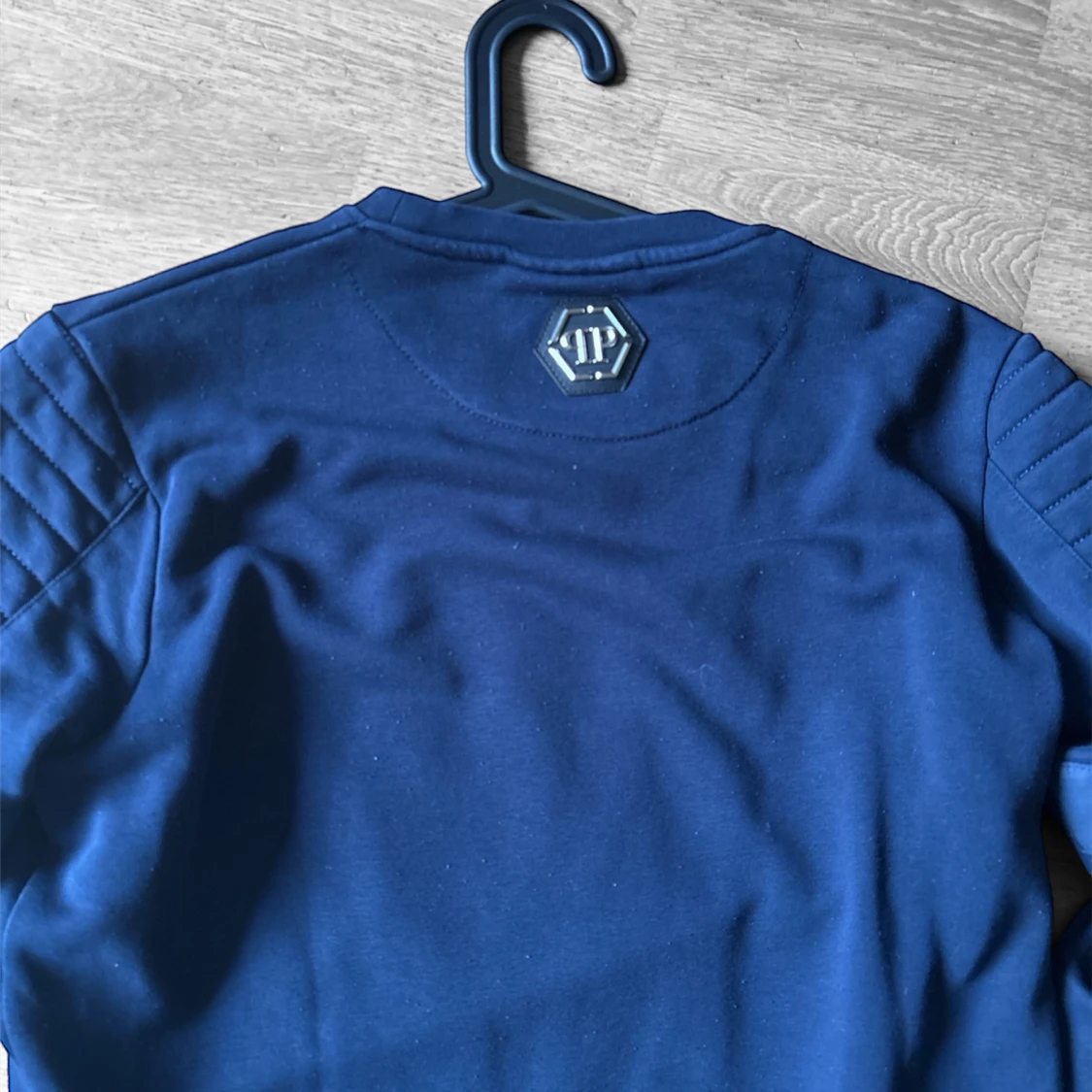 Säljer en marinblå sweatshirt från Philipp Plein med broderad logga framtill och coola quiltade detaljer på ärmarna. Tröjan har rund halsringning och är tillverkad i mjuk bomull. Perfekt för dig som gillar streetwear med lyxig känsla.