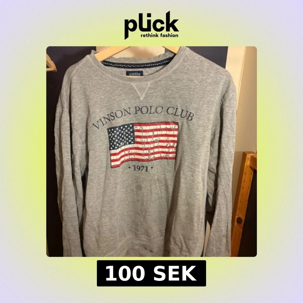 Säljer en grå sweatshirt från Vinson Polo Club med tryck av amerikanska flaggan och texten 'VINSON POLO CLUB 1971' på bröstet. Tröjan har rund halsringning och långa ärmar. Perfekt för en avslappnad och sportig stil.