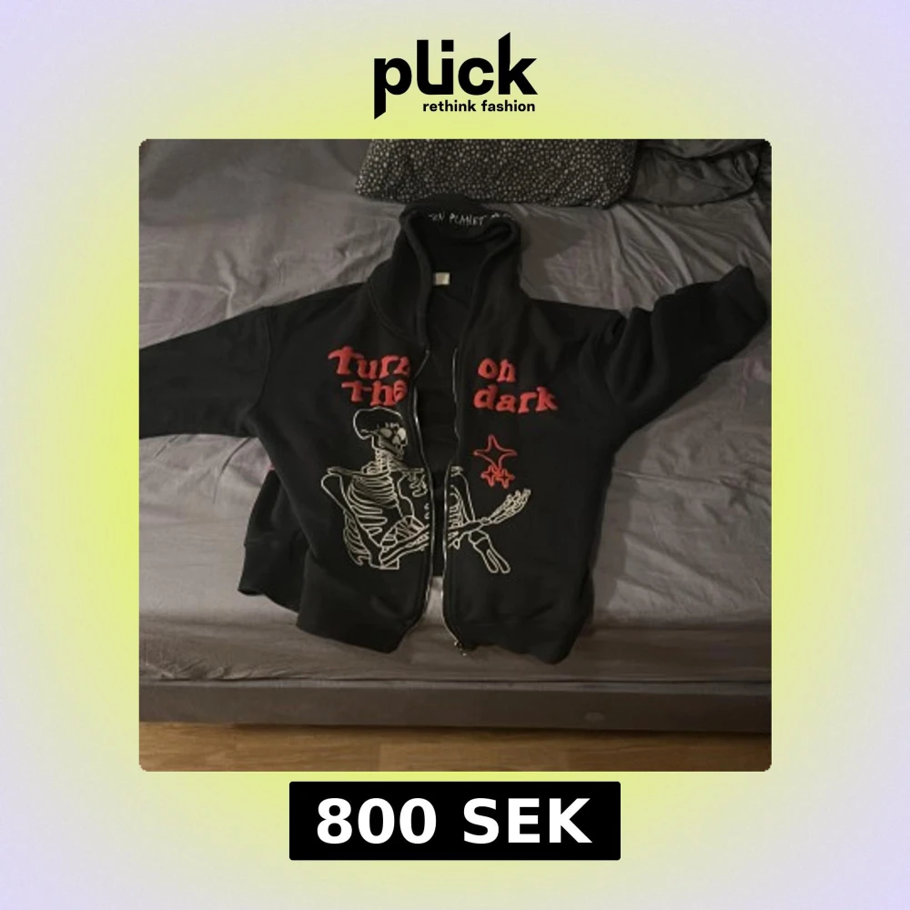 Svart hoodie från Broken Planet Market med dragkedja, huva och broderad text på luvan. Framsidan har ett stort skelett-tryck och röd text, samt röda stjärndetaljer både fram och bak. Oversized fit och riktigt streetwear-vibe.