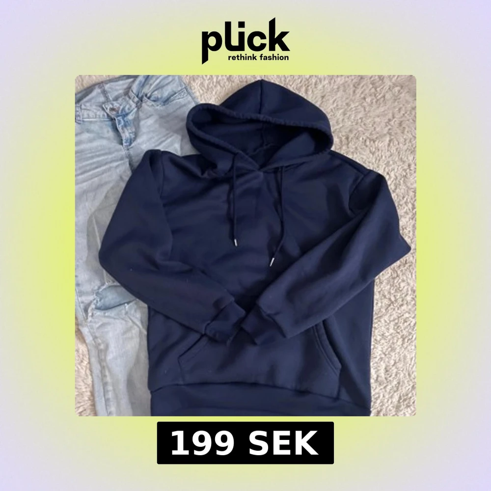 Säljer en mörkblå hoodie med huva och snörning. Tröjan har en stor magficka och ribbade muddar vid ärmslut och nederkant. Perfekt för chill dagar och enkel att matcha med jeans eller joggers.