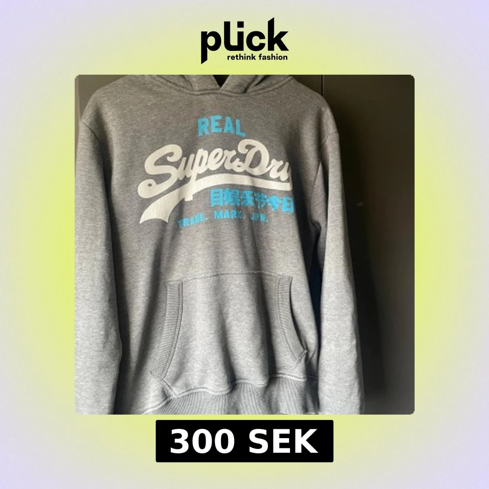 Säljer en grå hoodie från Superdry med tryck i vitt och blått på framsidan. Tröjan har en klassisk känguruficka och en bekväm huva med dragsko. Perfekt för en avslappnad stil.