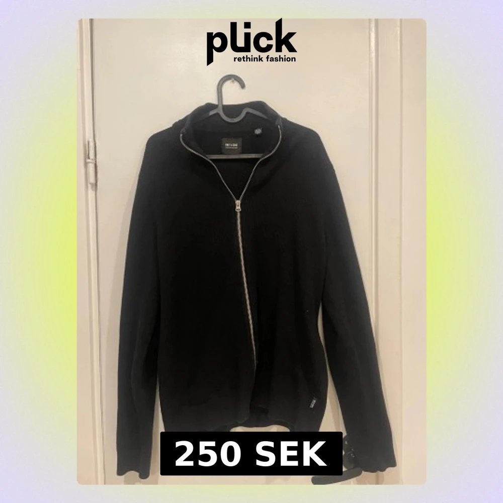 Svart stickad kofta från Only & Sons med hel dragkedja framtill och ribbad struktur. Tröjan har långärmad design och en stilren, enkel look som passar perfekt till jeans eller chinos. Snygg ståkrage och diskret logga vid nederkanten.