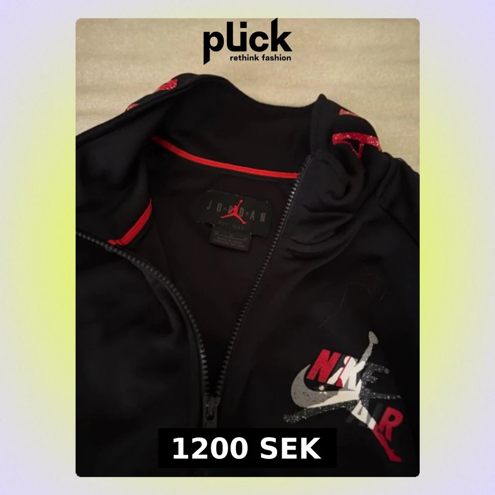 Säljer en svart zipjacka från Nike Air Jordan med röda och vita detaljer. Jackan har dragkedja, fickor framtill och texten 'AIR JORDAN' längs ärmarna. På bröstet finns ett stort Nike Air-tryck med Jumpman-loggan. Perfekt för dig som gillar sportig streetstyle.