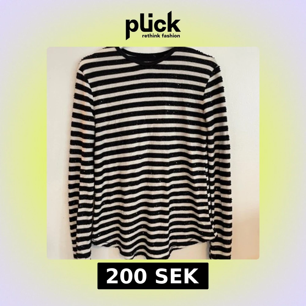 Svart och vit långärmad tröja med horisontella ränder och svarta paljetter på de svarta ränderna. Tröjan har rund halsringning och är i ett mjukt, stretchigare material.