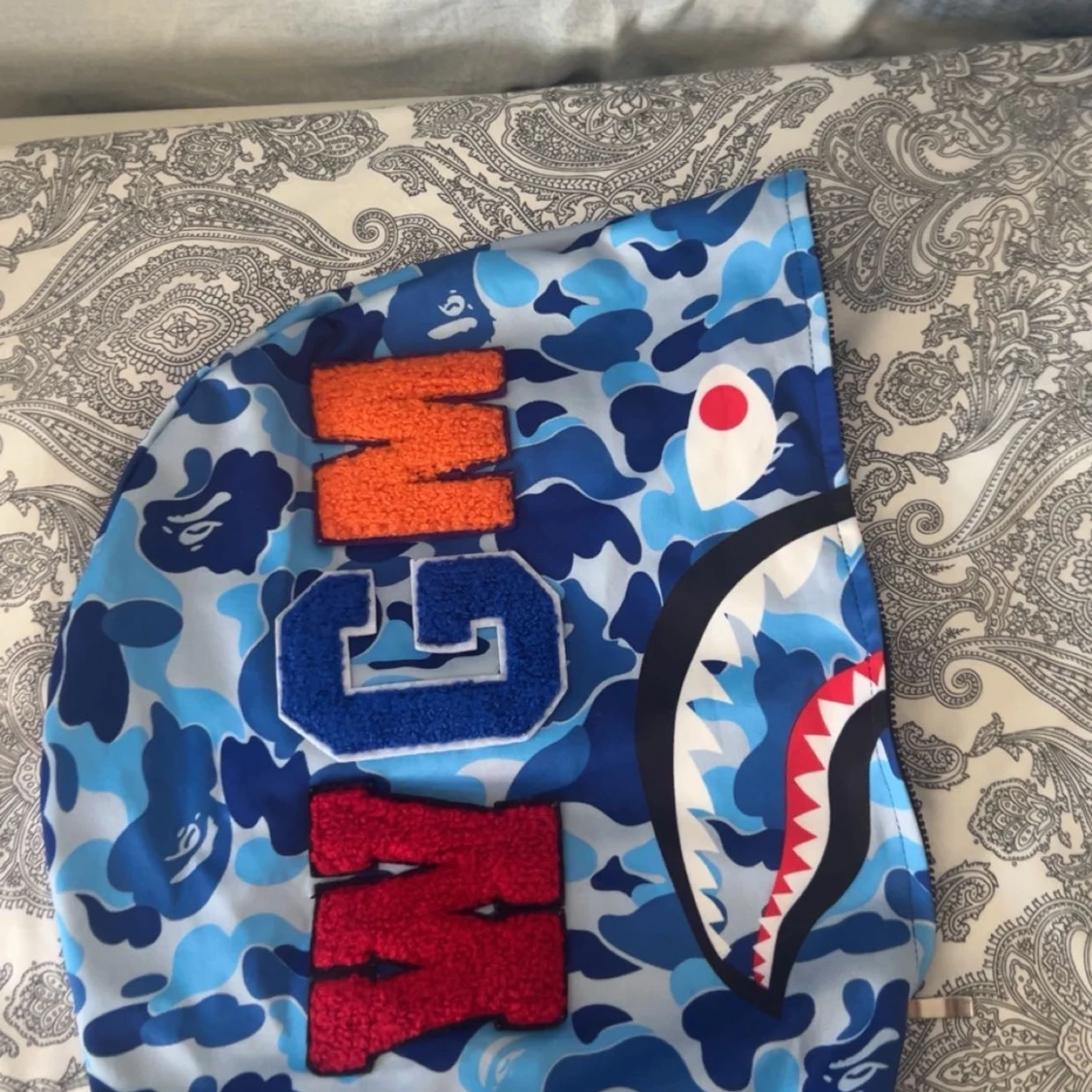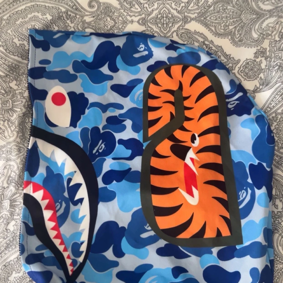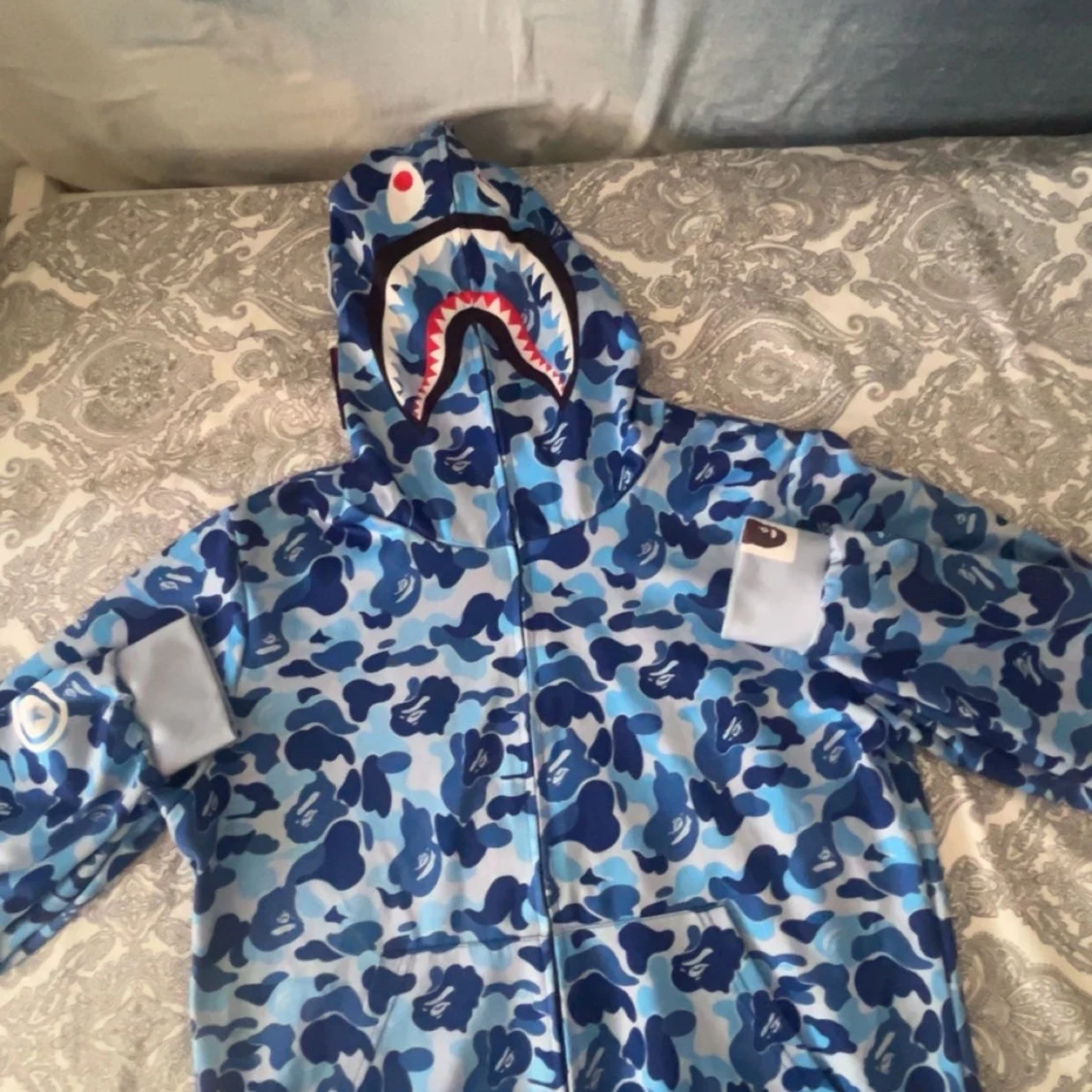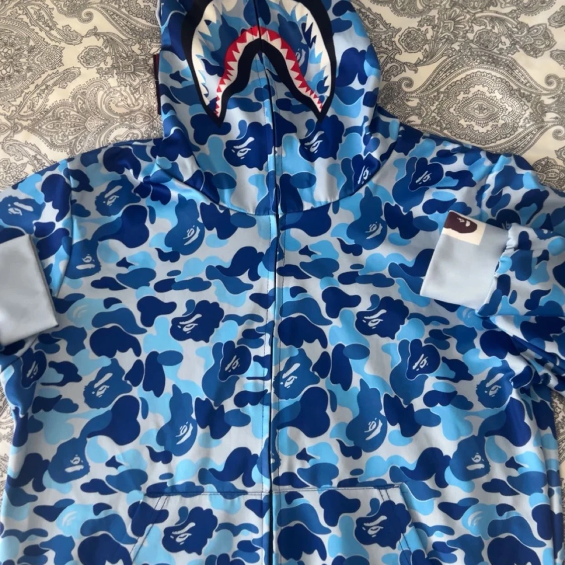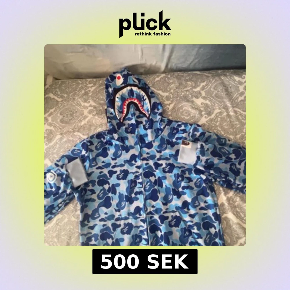 Säljer en ikonisk BAPE Shark hoodie i blå camo med dragkedja hela vägen och huva med hajansikte och broderade bokstäver. Tröjan har känguruficka och coola tiger- och hajdetaljer på huvan. Perfekt statement piece för streetwear.